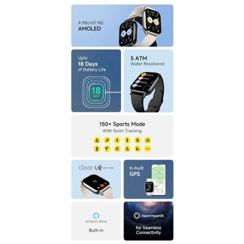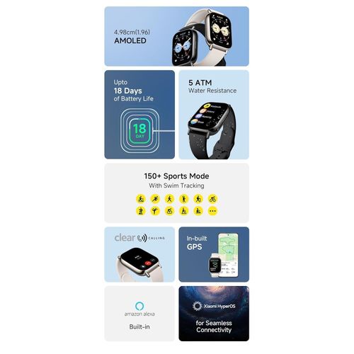 Key Features: Vibrant 1.96 inch Large Display with 600 nits peak brightness Enhanced Five-System GPS NCVM – Premium Metallic finish Experience smooth performance and an intuitive interface with the first Redmi smartwatch powered by Xiaomi HyperOS in India 5ATM Water Resistance: Safely use your smartwatch in water up to 50 meters deep