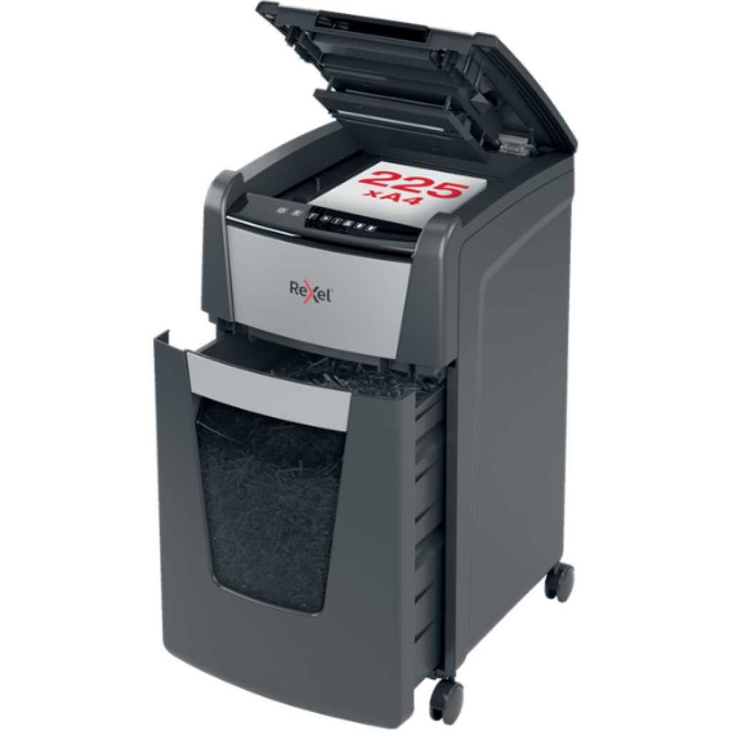Key Features: Automatic Feed – 225 Sheets P-4 Cross Cut (4x25mm) 60 Litre Bin Capacity Handles Staples & Paperclips Quiet Operation (55 dB)