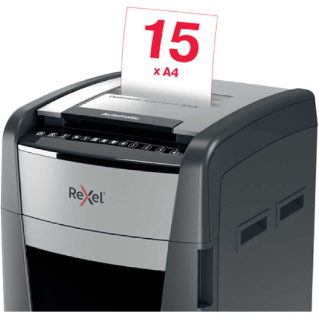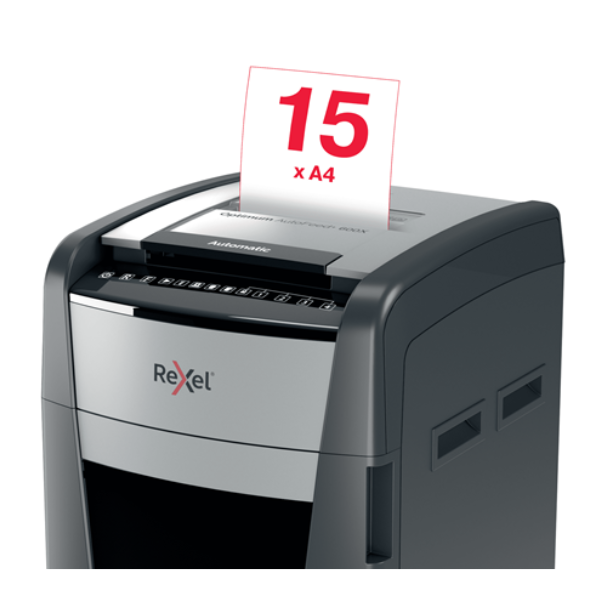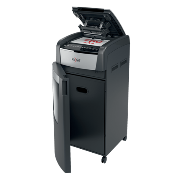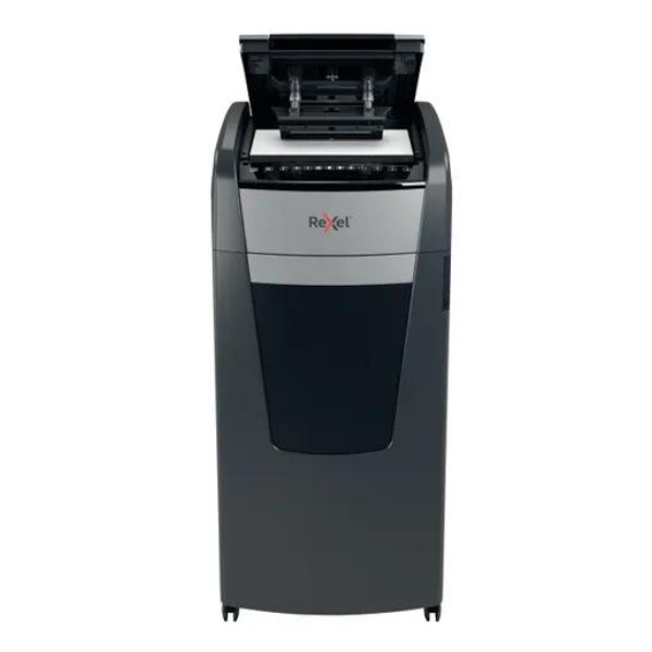 The Rexel Optimum AutoFeed+ 750M is a powerhouse automatic shredder designed for offices with heavy-duty shredding needs. This industrial-grade machine boasts an exceptional automatic feed capacity of up to 750 sheets (80gsm) at a time, significantly boosting productivity and minimizing shredding time. P-5 high-security micro cut technology ensures your most confidential documents are shredded into ultra-fine particles (2x15mm), offering the highest level of protection against information retrieval attempts. Unmatched Efficiency and Convenience The Optimum AutoFeed+ 750M prioritizes convenience. Simply load your documents into the automatic feeder, and the shredder takes care of the rest. Eliminate the need for manual feeding, freeing you to focus on more important tasks. The ultra-large 140-liter bin capacity significantly reduces the need for emptying, further enhancing workflow efficiency. Superior Security for Complete Peace of Mind This shredder offers unparalleled security for your most sensitive documents. Its P-5 micro cut shred size surpasses the requirements of DIN 66399, a recognized international standard for information security. The shredded particles are minuscule and virtually impossible to reconstruct, providing complete peace of mind for businesses handling highly confidential information such as financial data, legal documents, and employee records. Quiet Operation and User-Friendly Features Despite its powerful performance, the Rexel Optimum AutoFeed+ 750M operates at a remarkably low noise level of only 55 dBA . This ensures a peaceful working environment for you and your colleagues. The intuitive touch control panel offers effortless operation, while the PIN code lock adds an extra layer of security. The shredder also features auto-oil technology for optimal performance and anti-jam technology to prevent frustration and downtime. Additional Features: Manual feed slot for occasional shredding of smaller stacks of paper (up to 15 sheets) Shreds credit cards, staples, and paperclips for convenient all-in-one shredding 240 minutes continuous run time with fan cooling for extended shredding sessions Sleep mode activates after 3 minutes of non-use for energy efficiency Infrared bin full sensor alerts you when the bin needs emptying Castor wheels for easy mobility around the office Ideal for: High-volume office environments with heavy shredding demands Businesses handling top-secret documents Departments or teams requiring the highest level of security Professionals who value efficiency and user-friendliness Technical Specifications: Shredding Capacity (Automatic): Up to 750 sheets (80gsm) Shredding Capacity (Manual): Up to 15 sheets Shred Size: P-5 Micro Cut (2x15mm) Security Level: DIN 66399 P-5 (Higher than P-4) Bin Capacity: 140 Liters Noise Level: 55 dBA Continuous Run Time: 240 Minutes Cooling System: Fan Sleep Mode: Yes (3 minutes) Bin Full Sensor: Infrared Auto-Oil: Yes Anti-Jam Technology: Yes Shreds Credit Cards: Yes Shreds Staples and Paperclips: Yes Dimensions (WxDxH): 550 x 570 x 1062 mm Weight: 42kg