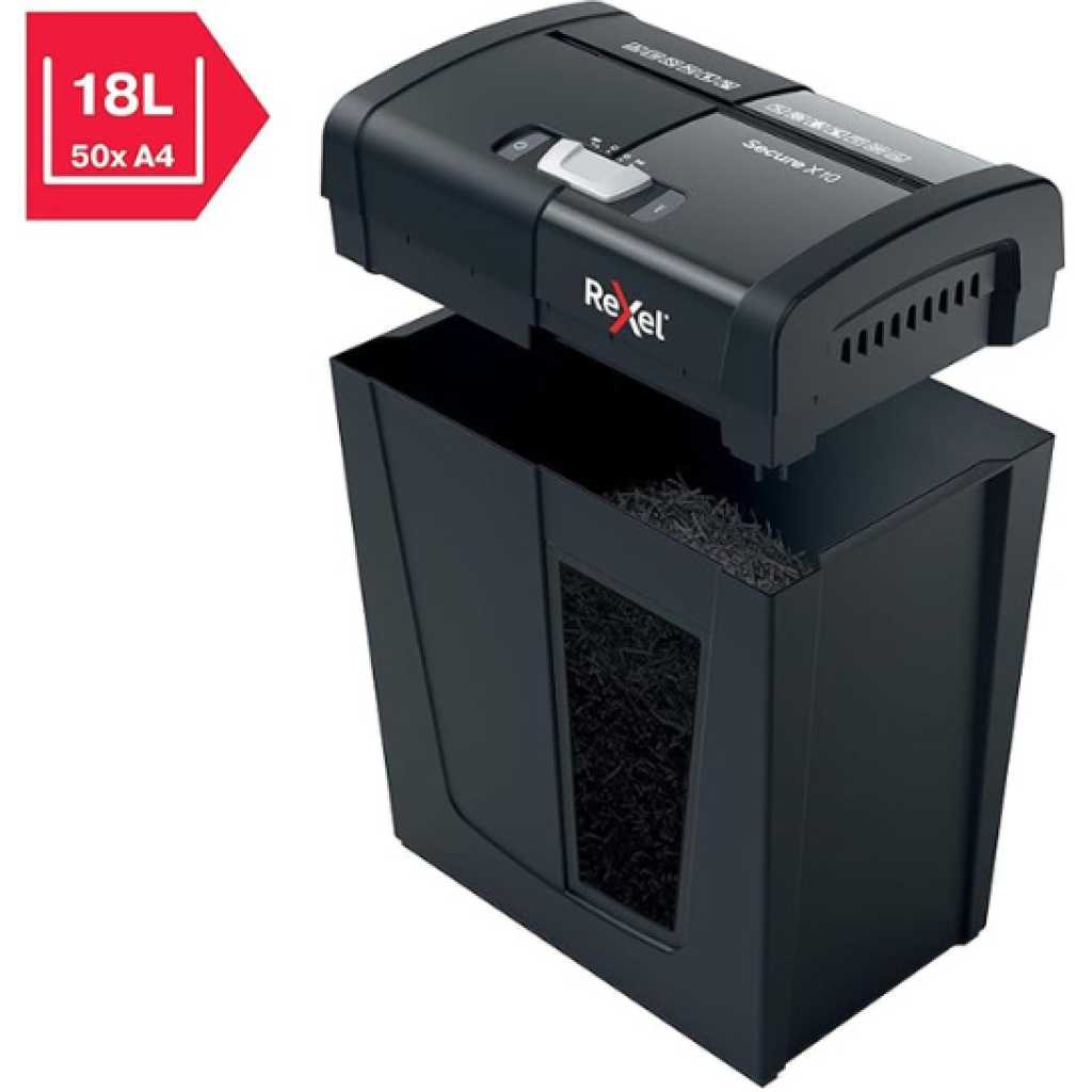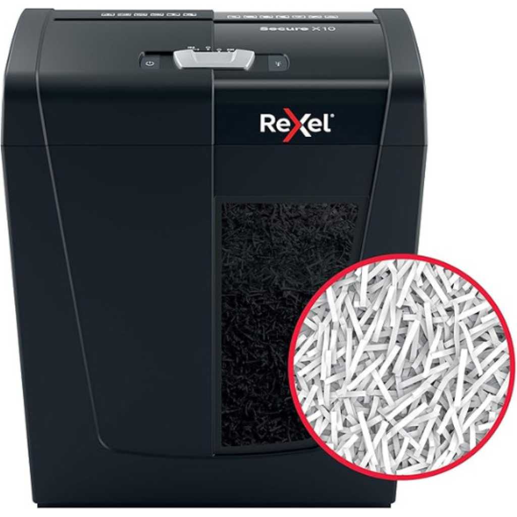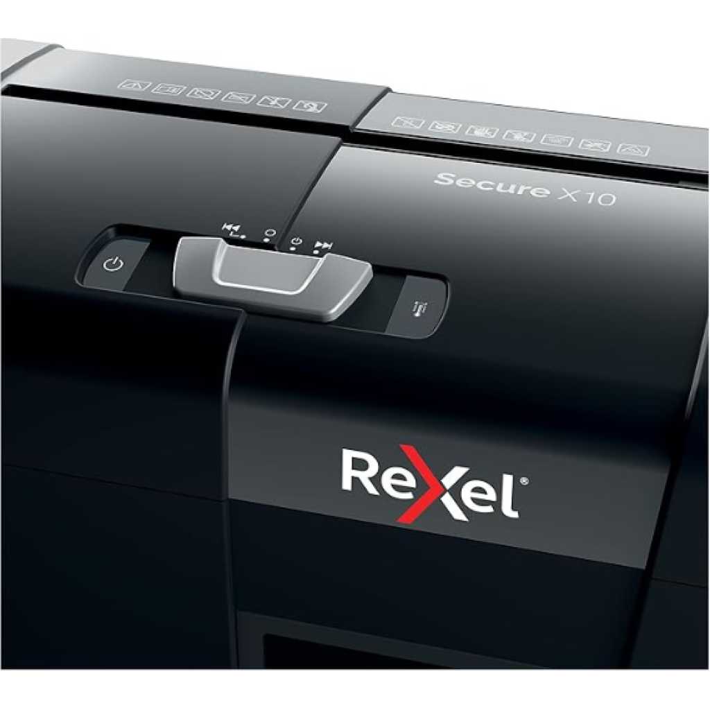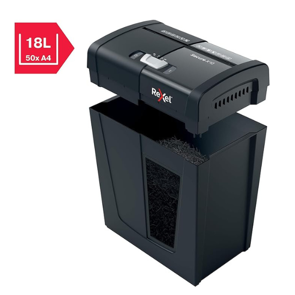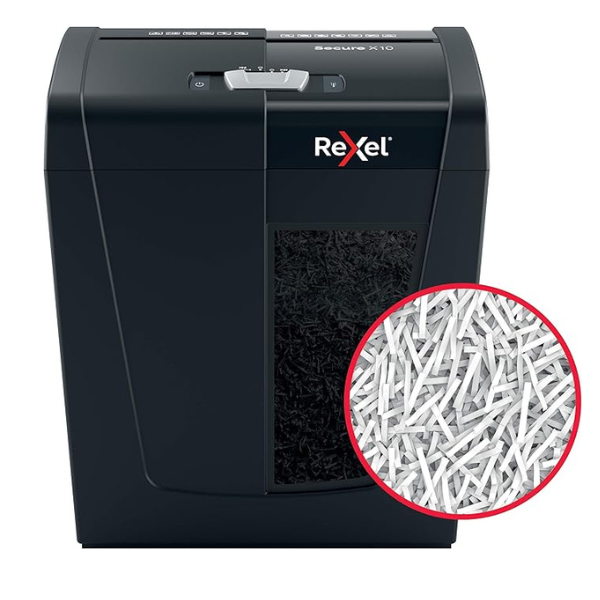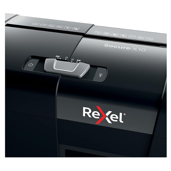 The Rexel Secure X10 is a user-friendly cross-cut shredder designed for personal and home office use. This convenient shredder offers a capacity of 10 sheets (80gsm), ideal for handling a wider range of small to medium shredding jobs. Enhanced Security with P-4 Cross-Cut Technology The Rexel Secure X10 utilizes P-4 cross-cut technology , shredding your documents into tiny particles measuring 4x40mm. This ensures excellent protection against information retrieval attempts, offering peace of mind when disposing of confidential documents such as bank statements, tax records, or medical bills. Designed for Convenience and Efficiency The Rexel Secure X10 prioritizes both convenience and efficiency. The user-friendly design allows for easy operation, while the compact size makes it a perfect fit for any desk or workspace. Quiet Operation for a Peaceful Environment Despite its efficient shredding capabilities, the Rexel Secure X10 operates at a remarkably low noise level of under 70 dBA . This ensures a peaceful environment for you and others around you while shredding confidential documents. Additional Features: Manual feed slot for convenient shredding Shreds staples and paperclips for all-in-one shredding capability 3-minute continuous run time for small shredding jobs Manual reverse function to clear paper jams Transparent bin window allows you to monitor the bin fullness 18-liter bin capacity holds approximately 150 shredded A4 sheets 2-year warranty for peace of mind Ideal for: Home offices and personal use Shredding small to medium volumes of documents Individuals who value security, convenience, and quiet operation Technical Specifications: Shredding Capacity (80gsm): 10 Sheets Shred Size: P-4 Cross Cut (4x40mm) Security Level: DIN 66399 P-4 Bin Capacity: 18 Liters Noise Level: Under 70 dBA Continuous Run Time: 3 Minutes Bin Full Sensor: No Auto-Oil: No Anti-Jam Technology: Manual Reverse Shreds Credit Cards: No Shreds Staples and Paperclips: Yes Dimensions (WxDxH): 238 x 381 x 407 mm Weight: 5.2kg