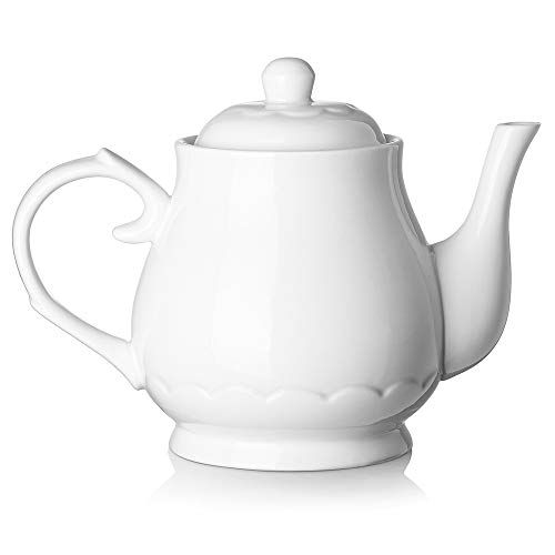Key Features: Round Ceramic Teapot, 24 Ounces. White Porcelain Teapot: Steep and serve warm green tea, herbal tea, detox or medicinal tea with this classic porcelain tea pot. Tea Time: Our white tea pot is designed with a lip at the end of the pouring spout that helps prevent against drips; opening measures 2.5 inches for tea strainer balls. Hand Wash Only: Rinse the porcelain teapot, with warm water and a basic sink brush after each use; do not put the teapot into the dishwasher. Reliable Quality: The white teapot is made from durable porcelain that offers superior heat retention, ensuring your tea will stay hot for hours of enjoyment. Capacity: The cute teapot has a capacity 24 ounces for approximately 3 teacups; please note: this tea pot is not for stovetop use, we recommend to boil water in a separate vessel first.