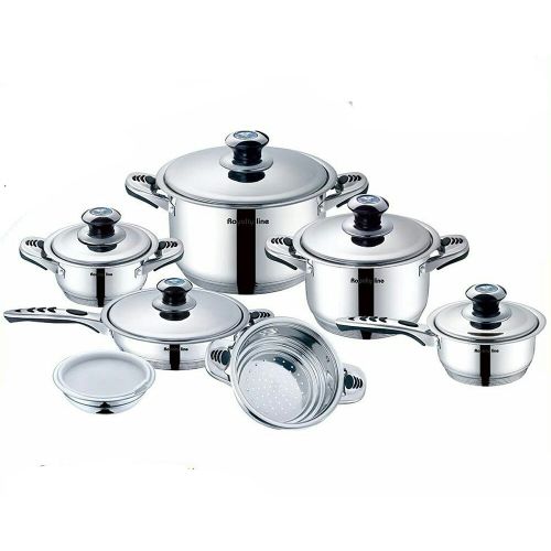 Key Features: Royality Line 16 Piece Stainless Steel Saucepans Cookware Pots, Silver. Handling support handles are partially covered with set material for moving hot pans without discomfort. Frying pan with a strong stainless steel body; cover with exhaust hole; coating pan; suitable for all kitchens Thermo Control cooking your food with one knob cookware helps you find the perfect mix and taste. With easy to read thermo knob, you can check the heat inside your pan and adjust the cooking power accordingly. Product Details: Frying pan 24 x 6.5 cm, saucepan with metal lid 24 x 14 cm saucepan with metal lid 20 x 10 cm diameter: 16 x 8 cm saucepan with metal lid 16 x 8 cm saucepan with a metal lid steamer 20 x 9.5 cm), bowl (20 cm) with plastic lid suction knob Bakelite Mat x 2 pieces.