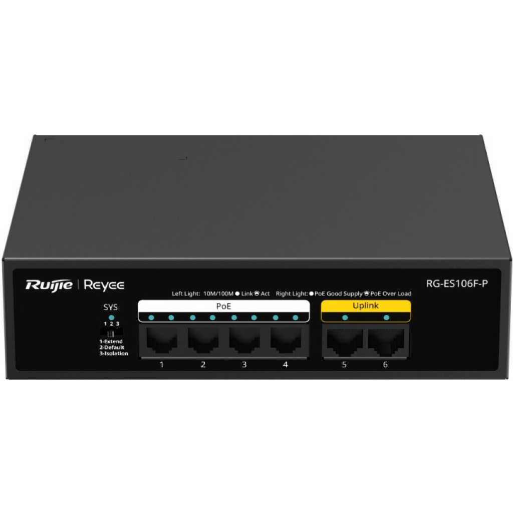 RG-ES106F-P, 6-Port 10/100 Mbps Unmanaged PoE Switch Versatile: Can be used with a variety of devices, including IP cameras, access points, and other PoE-enabled devices. Intelligent and Secure: Suitable for use in CCTV networks, offering intelligent PoE management and secure operation. 10/100 Mbps: Suitable for smaller networks or applications where gigabit speeds are not needed. PoE+ Support: Provides power and data to PoE+ devices (up to 25.5W per port). Ruijie Cloud Visibility: Can be managed and monitored through Ruijie Cloud. Plug-and-Play: Connect and power devices without additional setup. Unmanaged: Easy to use, no configuration required. Fanless Design: Operates quietly and reliably.