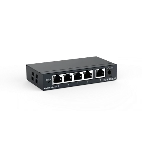 Key Features: Ruijie RG-ES105D 5-port 10/100 Mbps Unmanaged Desktop non-PoE switch 5-port 10/100 Mbps desktop unmanaged non-PoE switch Unmanaged switch, which is visible on Ruijie Cloud App Large buffer for smooth data transmission Intelligent PoE management High network reliability High-quality design