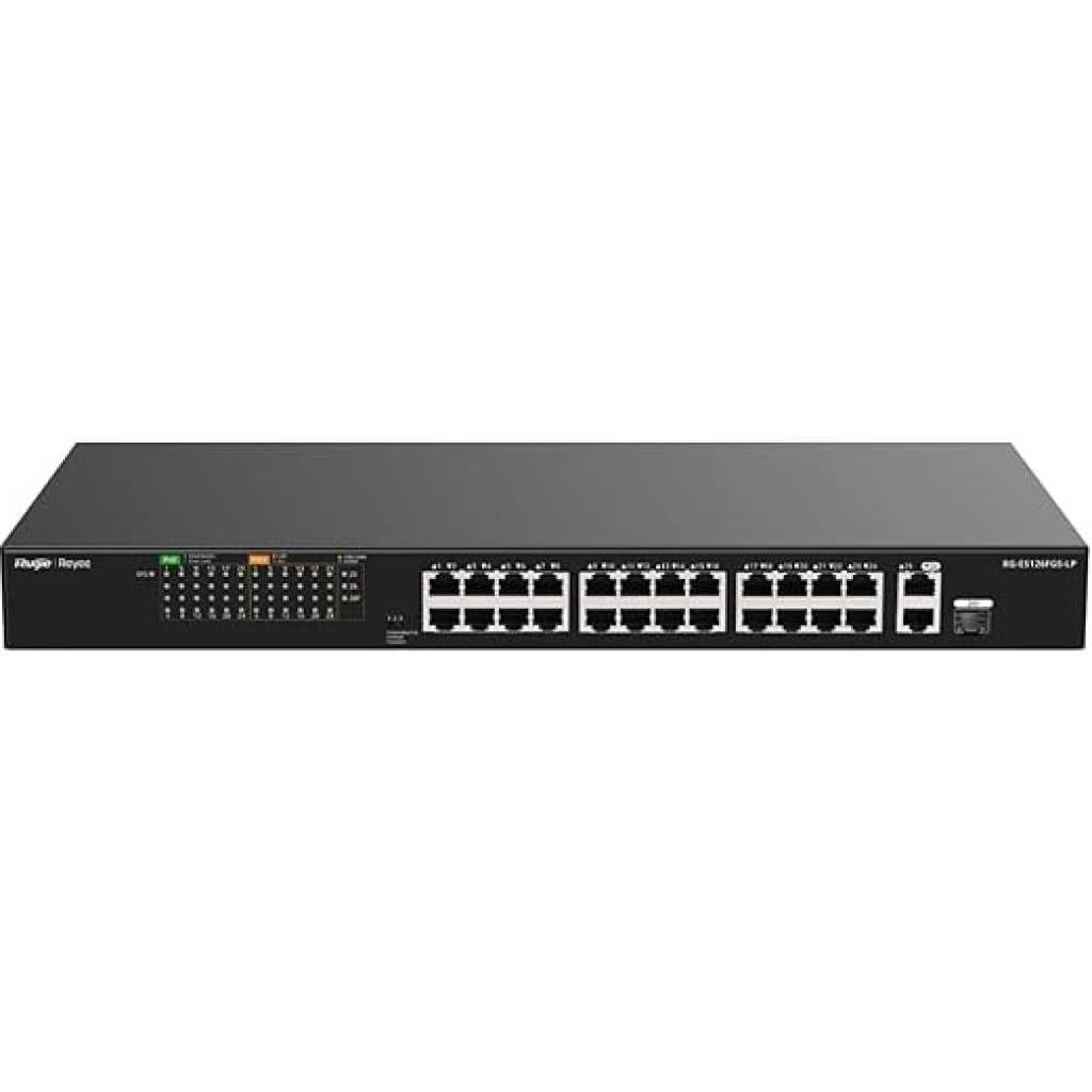Key Features: Ruijie RG-ES126FGS-LP, 24-Port 10/100 Mbps with 2-Port Gigabit Unmanaged PoE Switch 24-port 10/100 Mbps with 2-port Gigabit unmanaged PoE switch Unmanaged switch, which is visible on Ruijie Cloud Intelligent and secure CCTV network Intelligent PoE Management High-quality design Applicable to various scenarios