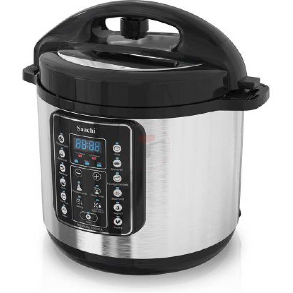 Key Features: Saachi 14 In 1 Multi Function 6L Electric Pressure Cooker – Silver, Black. 14 cooking programs 10 Automatic preset cooking programs: Rice, Multigrain, Porridge, Egg, Steam, Slow cook , Sauté, Meat/Stew, Soup/Broth. Automatic keep-warm function up to 24 hours Adjustable temperature control from 140 to 160°C Accessories: Plastic spoon, Measuring cup Manual Pressure cooker settings: Low, Middle and High Overheat protection