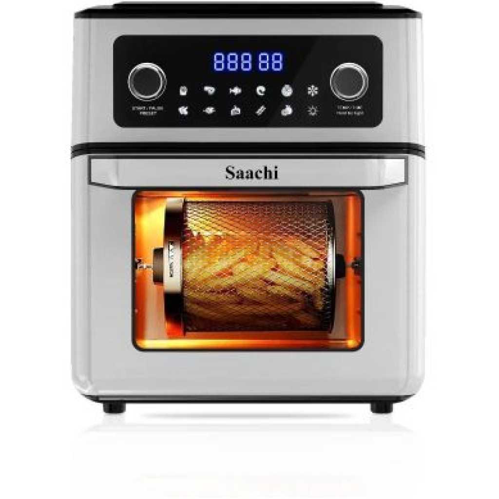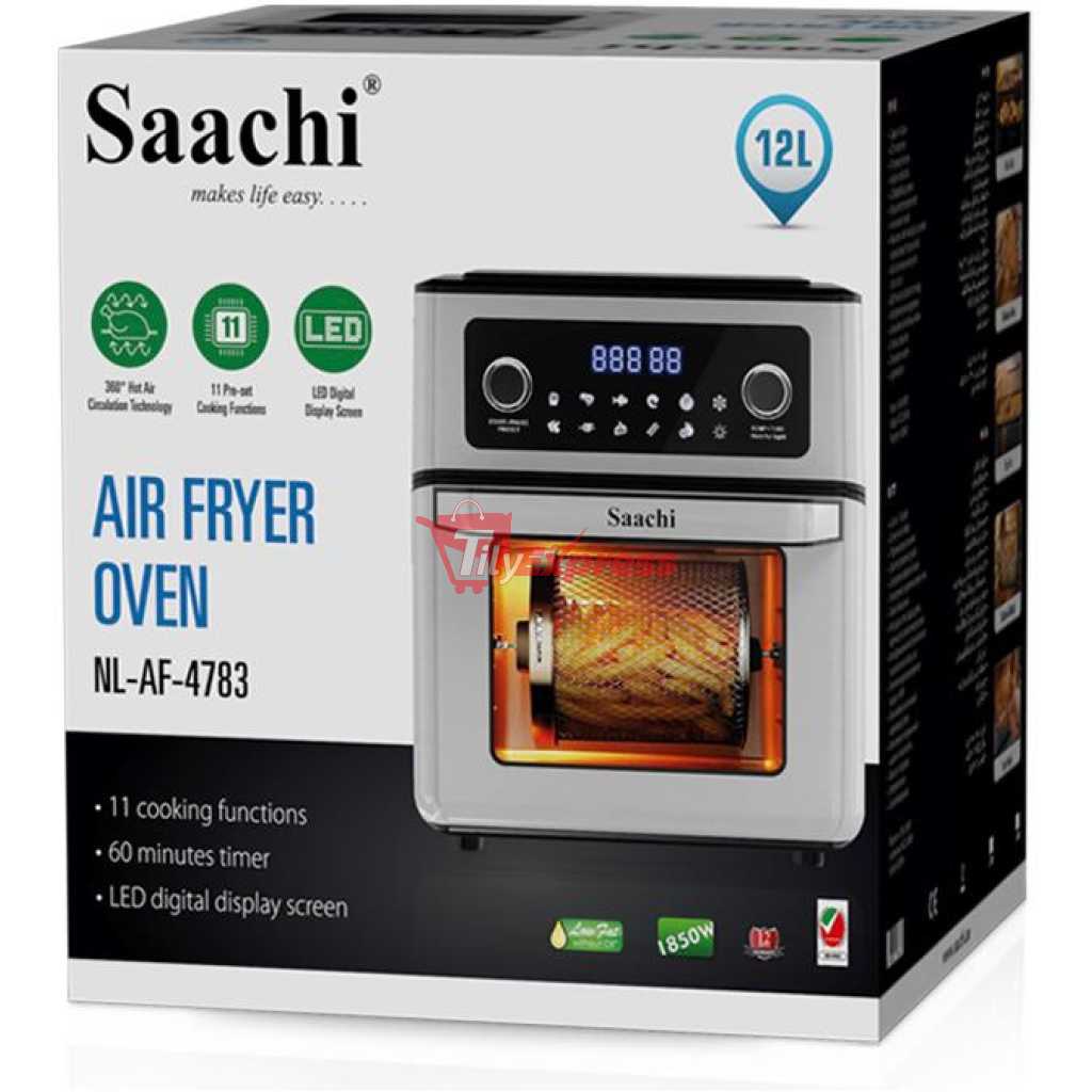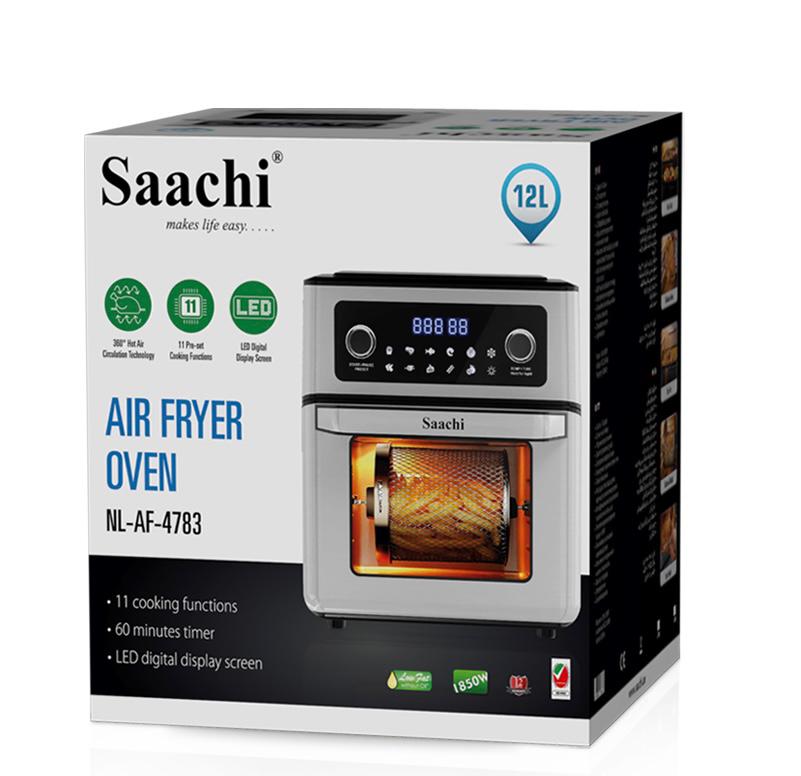 Key Features: Saachi 12-Litres Air Fryer With 11 Cooking Functions NL-AF-4783. Capacity: 12 Litres 60 minutes timer 11 cooking functions Simple control knob LED digital display screen Adjustable thermostat control Heat-resistant handle Accessories: mesh rack, drip tray, handle, rotisserie basket & rotisserie forks Multi-functional cooking with little to no oil 360° hot air circulation technology Metal stainless steel appearance Dishwasher safe and easy to clean Overheat protection Observation window Light indicator