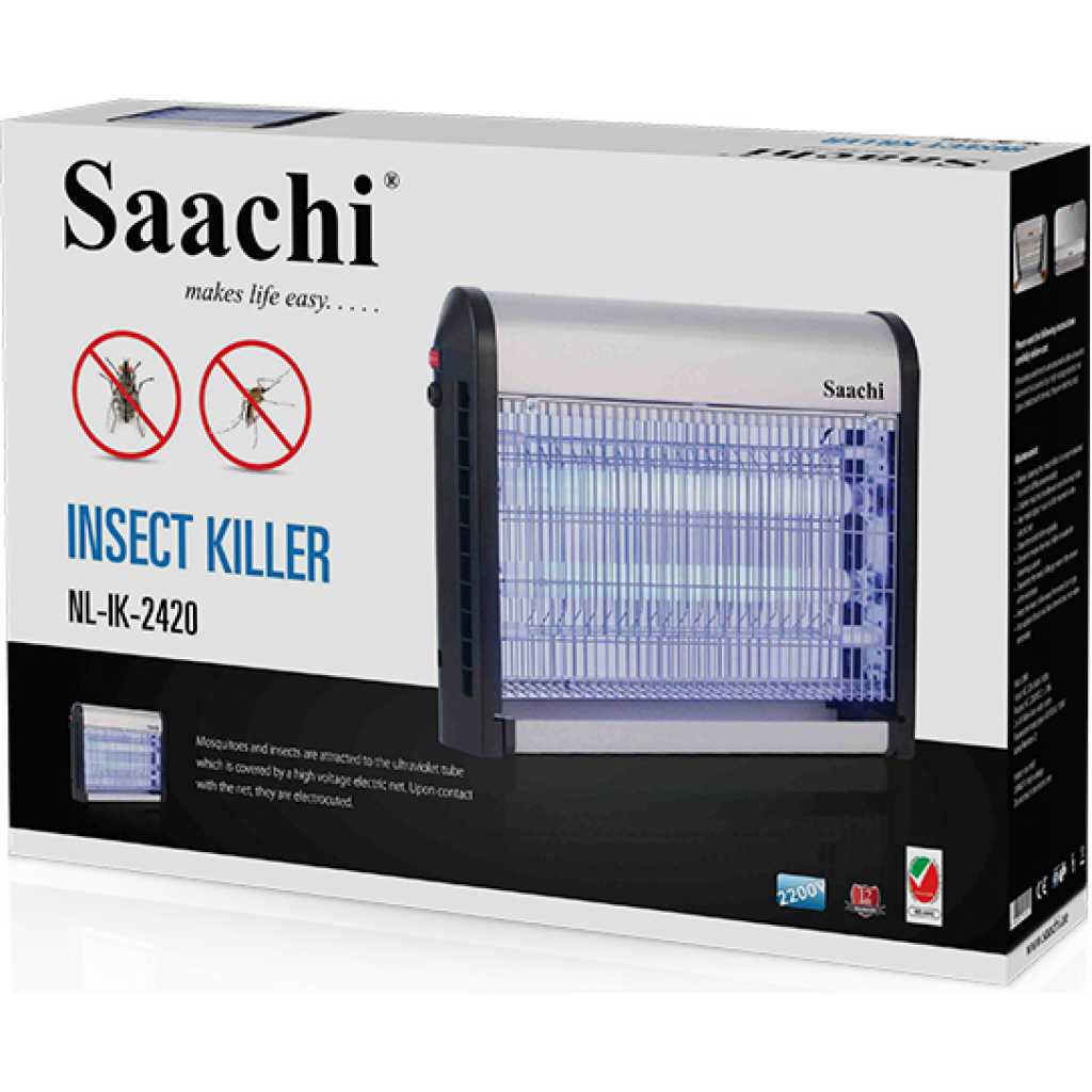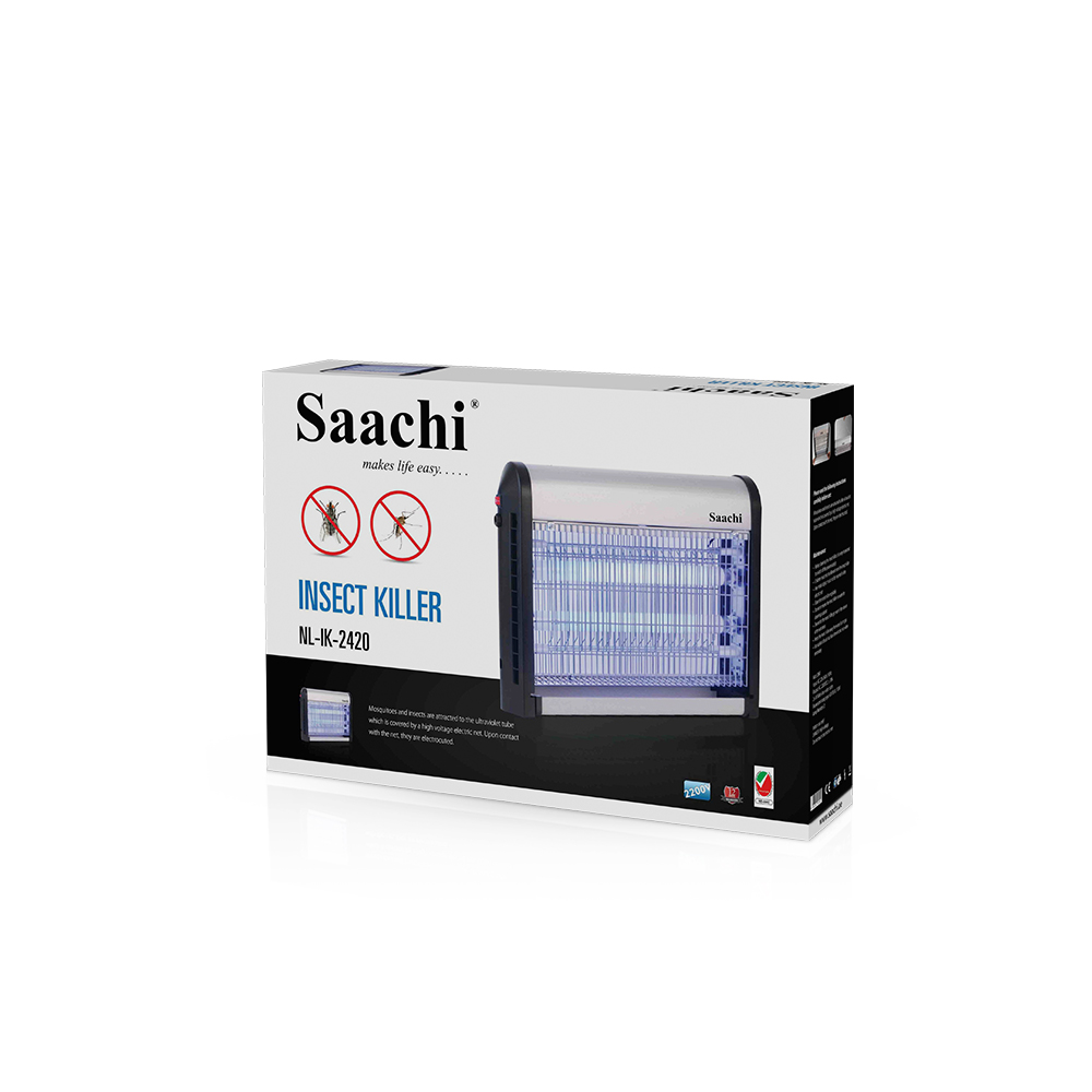 Damn those pesky insects, we hate them too! The Saachi Insect Killer is a must have appliance if you, like us, do not appreciate flies buzzing around you while you try to have a meal or simply take a nap. The insects are attracted to the UV light emitted by the appliance after which they are caught in the net, electrocuted and collected in the tray at the bottom of the appliance to be disposed off. This convenient product can either be placed on a table top or hung on the ceiling via the hooks on the top of the appliance. Watt: 20W Input: AC 220-240V; 50/60Hz Output: AC 2200VDC ± 10% 2 x 10 Watt ultra-violet tubes Fluorescent lamp type: G13 T8 BL F10W Lamp Number: 2 Weight: 1.80 kgs Dimensions: 41 x 9.5 x 32 cm