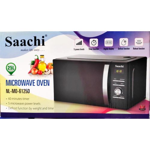 The Saachi Microwave Oven NL-MO-6125D comes with a 25 litres capacity and a 245mm glass turn table. It has a 30 minutes timer and 6 power levels allowing for adjustments to be made based on your optimum microwaving needs. This appliance is also capable of defrosting by weight making it a perfect addition to your kitchen. Features – 25 litres capacity – With timer up 30 minutes – 6 power levels – Defrost by weight function – Cooking end signal – 245mm glass turn table