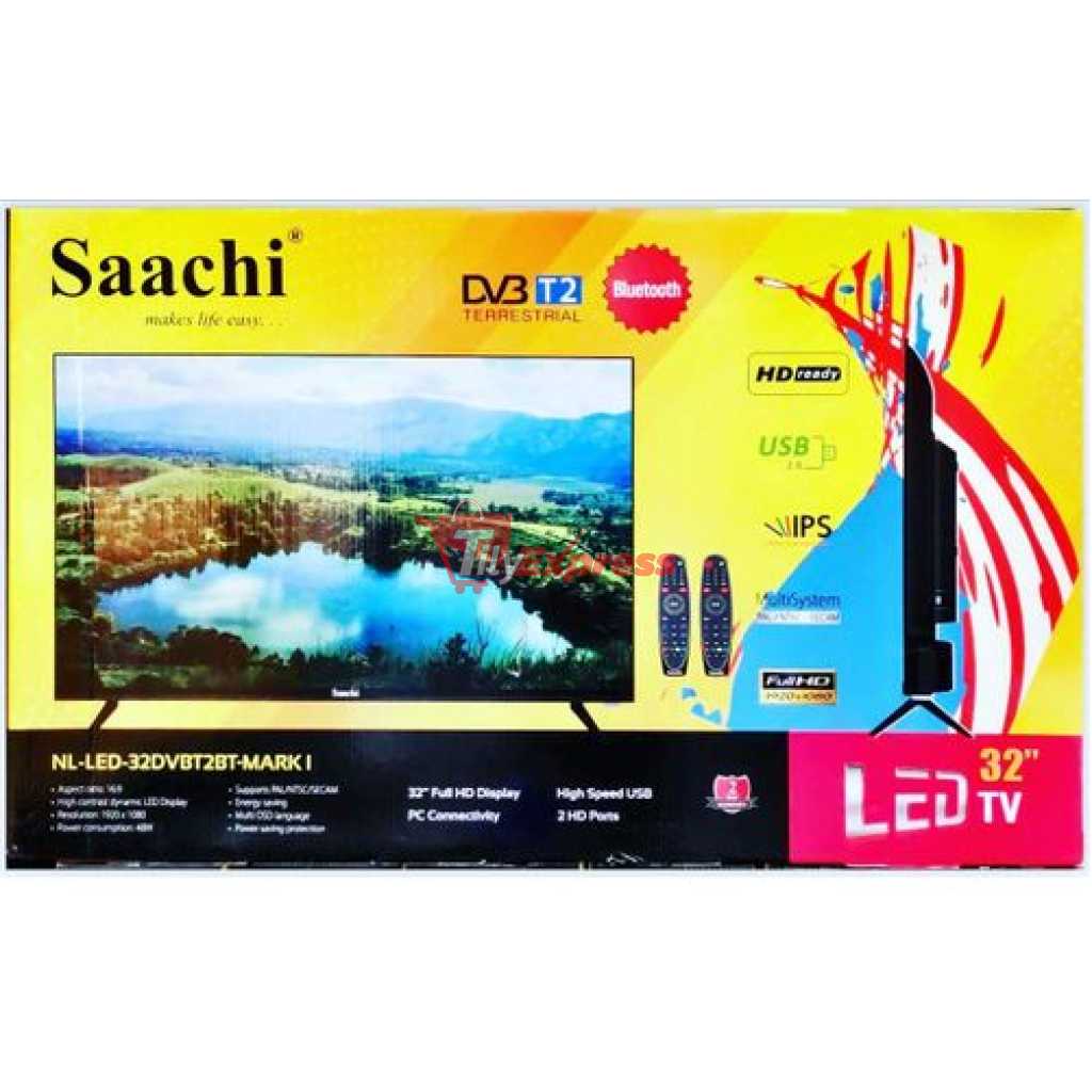 Key Features: Saachi 32″ Inch Digital Frameless TV With Inbuilt Decoder & Bluetooth Enabled – Black. Bluetooth 2HD Ports Full High Definition Frameless High speed USB Screen Size: 32 Inches Display Technology: LED Digital DVB-T2 Ready Resolution: Full HD Ready