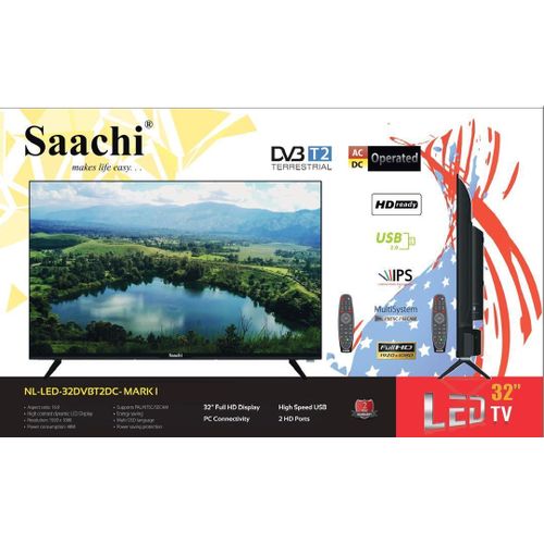 Saachi 32″ Frameless Digital TV- Black The 32″ backlit LED panel of the television produces eye catching HD resolution images that are simply stunning to look at. This TV also has a number of ports to keep you well connected at all times, and these include the USB and HDMI ports. 32″ LED Displays the Saachi 32 inch HD LED TV’s makes a perfect addition to contemporary rooms. When switched on, the backlit LED screen churns out images and videos with amazing contrast and details. High Definition TV. The Hisense 32″ HD LED display generates amazingly clear, razor sharp images with a resolution of full HD. More over, it comes with the latest DVB-T2 technology for the best & clearest digital TV signals so you can enjoy in-built free local TV channels off the box. Digital LED Technology witness the entire RCG spectrum brought to life on your screen. The Saachi LED TV brings you exceptionally vibrant and true-to-life images delivered just as the director imagined. USB Digital Media Player provides you the flexibility to enjoy not only photos or music, but also HD multimedia files directly in your TV via USB. explorer more connectivity options the tv features 1 USB 2.0 ports, and 2 HDMI ports to which you can connect your DVD players, cameras, external hard drives, and more. Now you can enjoy all your multimedia content of these gadgets on the big screen, right from the comfort of your couch. It also features audio input. Technical Specifications Display•Technology: LED•Screen Size: 32 Inches •Resolution: Full HD•Display Ratio: 16:9; FHD Ready Audio•MAX Audio Output (RMS): 6W + 6W•Dolby Digital•Sound Equalizer•Audio File Format: MP3, AAc, M4A, WAV Video:AV Colour Format: PAL, NTSC, SECAMComponent Mode: 480i/60Hz, 480p/60Hz, 576i/50Hz, 576p/50Hz, 720p/50Hz, 720p/60Hz, 1080i/50Hz, 1080i/60Hz, 1080p/50Hz, 1080p/60HzVGA Mode: 640 x 480, 800 x 600, 1024 x 768, 1280 x 1024 – 60HzHDMIMode: 480i/60Hz, 480p/60Hz, 576i/50Hz, 576p/50Hz, 720p/50Hz, 720p/60Hz,1080i/50Hz, 1080i/60Hz, 1080p/50Hz, 1080p/60Hz. 640 x 480, 800 x 600, 1024 x 768 – 60HzUSB Video Format: AVI, MKV, FLV, TS, MP4Photo Format: JPEG Connectivity:•HDMI: 2 •USB: 1•Optical Output: 1 •Audio Jack: 1•AV Input: 1 Features : •Narrow Frame •Digital Media player •Digital High Definition Tuner Television System •PVR, DV3 Digital Receiver Power •Energy Efficiency class A + •Power Supply: AC 220-240V 50/60Hz •Power Consumption On-Mode: 30W •Annual Energy Consumption: 44 kWh per year on 4 hours operation for 365 days. Note: Due to the difference between different monitors, the picture may not reflect the actual color of the item. We guarantee the style is the same as shown in the pictures. Thank you! Make your order here today and have TilyExpress deliver it right at your most convenient picking point or doorstep Please enjoy more shopping of wide range of items at affordable prices on our store at www.tilyexpress.ug