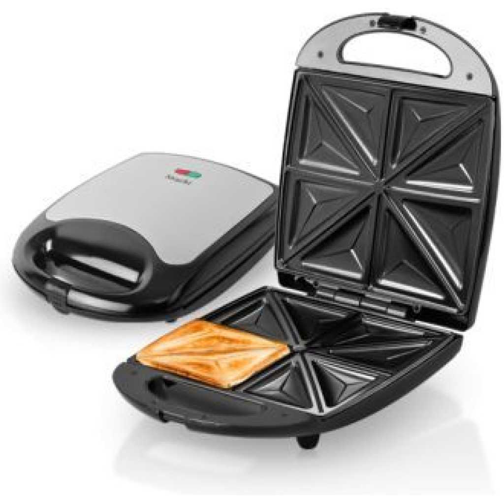 SAACHI 4 PCS SANDWICH MAKER – BLACK The Saachi Sandwich Maker, NL-ST-4655S, can make up to 4 sandwiches that are cut into 8 neatly shaped triangles. The automatic thermostat with indicator lights allows you to go about the rest of your tasks until the green light notifies you that your sandwich is ready. The non-stick plates prevent a mess from being formed in the sandwich maker enabling you to enjoy a delicious meal stress-free. Finally, the locking mechanism ensures safety while the sandwich maker is on, making it a safe product to use around children