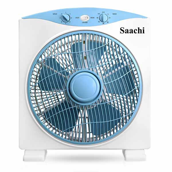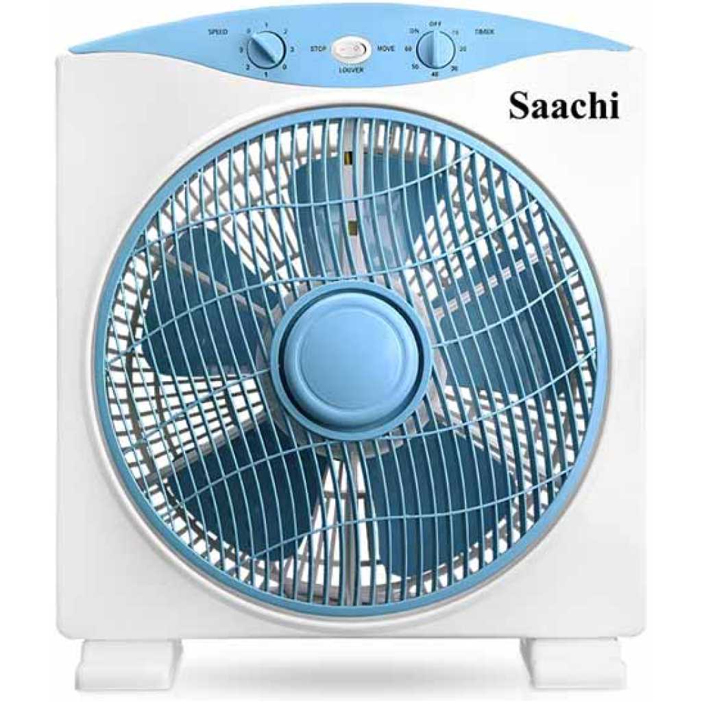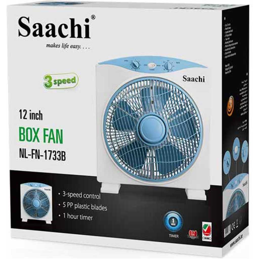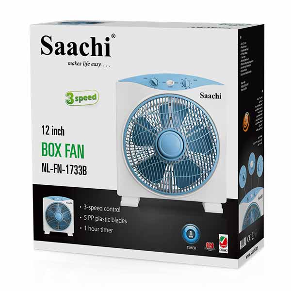 Key Features: Saachi Box Fan With 3 Speed Control, 12-Inch – NL-FN-1733B – White. Powerful motor speed control knob 5 PP plastic blades 1 hour timer Revolving front louver Efficient cooling and quiet operation Low electricity consumption Safe and reliable Easy to install and disassemble
