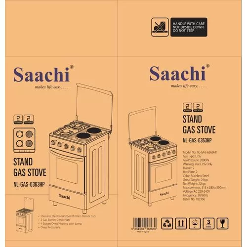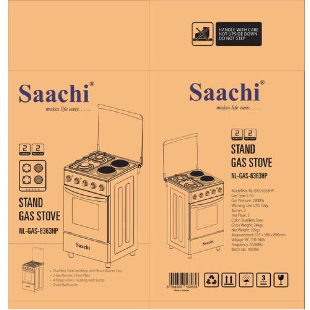 2 Gas + 2 Electric Stainless Steel Stove/Cooker with Gas Oven (50X50cm) – Silver Black Experience versatile and efficient cooking with the Saachi 2 Gas & 2 Electric Cooker with Gas Oven NL-6363HP (50X50cm) – Silver & Black. This modern and stylish cooker is designed to meet all your culinary needs. Whether you’re boiling, frying, baking, or grilling, the Saachi NL-63HP62 ensures you achieve delicious results with ease. The Saachi NL-6363HP Cooker features 2 Gas & 2 Electric Cooker with Gas Oven allowing you to cook multiple dishes simultaneously. The gas burners provide instant heat and precise temperature control, perfect for various cooking techniques. This cooker also includes a spacious gas oven, ideal for baking, roasting, and grilling. The gas oven ensures even heat distribution for perfectly cooked meals every time. Please buy it from TilyExpress Uganda today. The oven door features a transparent window, allowing you to monitor your dishes without opening the door and losing heat. Designed for convenience and durability, the Saachi NL-6363HP boasts a robust construction with a sleek black & Silver finish, adding a touch of elegance to any kitchen. The easy-to-clean surfaces and removable burner caps make maintenance a breeze, while the integrated safety features, such as flame failure protection, ensure safe operation. Enhance your cooking experience with the Saachi NL-6363HP 2 Gas & 2 Electric Cooker Combining versatility, efficiency, and stylish design, this cooker is the perfect addition to any kitchen, making meal preparation easier and more enjoyable. Features Stainless Steel Worktop With Brass Burner Cap Glass Top 2 Gas Burners21 Electric ( Hot plate ) 4 Stages Oven Heating Oven Lamp Oven Rottisserie Model No: NL-Gas-6363HP Gas Type: LPG Gas pressure: 2800pa Color: Stainless Steel Gross weight: 24kgs Net Weight: 22kgs Measurements 515x580x890 Voltage: AC 220-240 Frequency:50/60Hz