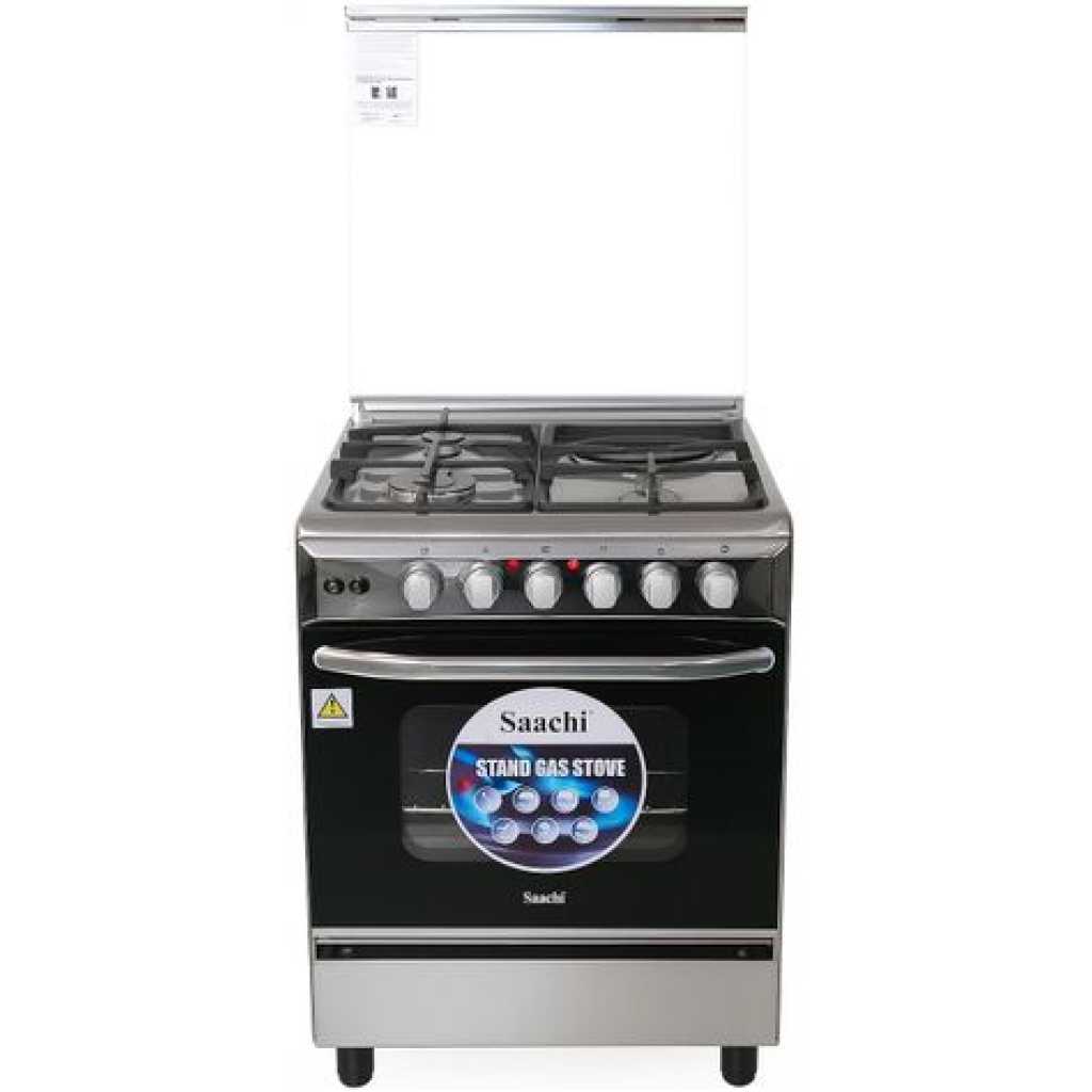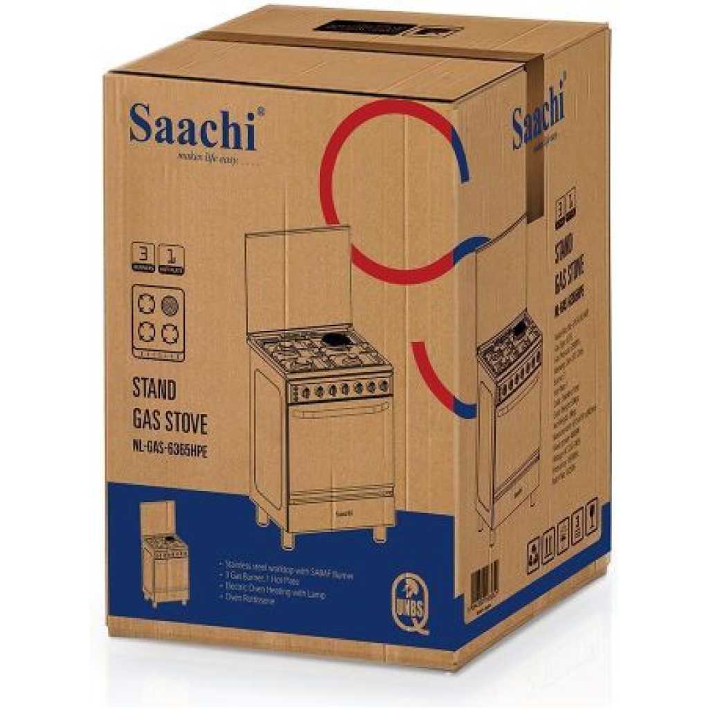 Key Features: Saachi Cooker 3 Gas Burners + 1 Electric Plate 60x60cm NL-6365HPE, Electric Oven & Grill, Rotisserie, Cast Iron Pan Supports – Silver. Stainless Steel Worktop With Brass Burner Cap Glass Top Cast Iron Pan Supports 3 Gas Burners 1 Electric ( Hot plate ) 4 Stages Oven Heating Oven Lamp Baking Tray Oven Grill Oven Rottisserie Model No: NL-6365HPE Gas Type: LPG Gas pressure: 2800pa Color: Stainless Steel Gross weight: 24kgs Net Weight: 22kgs Measurements Voltage: AC 220-240 Frequency:50/60Hz