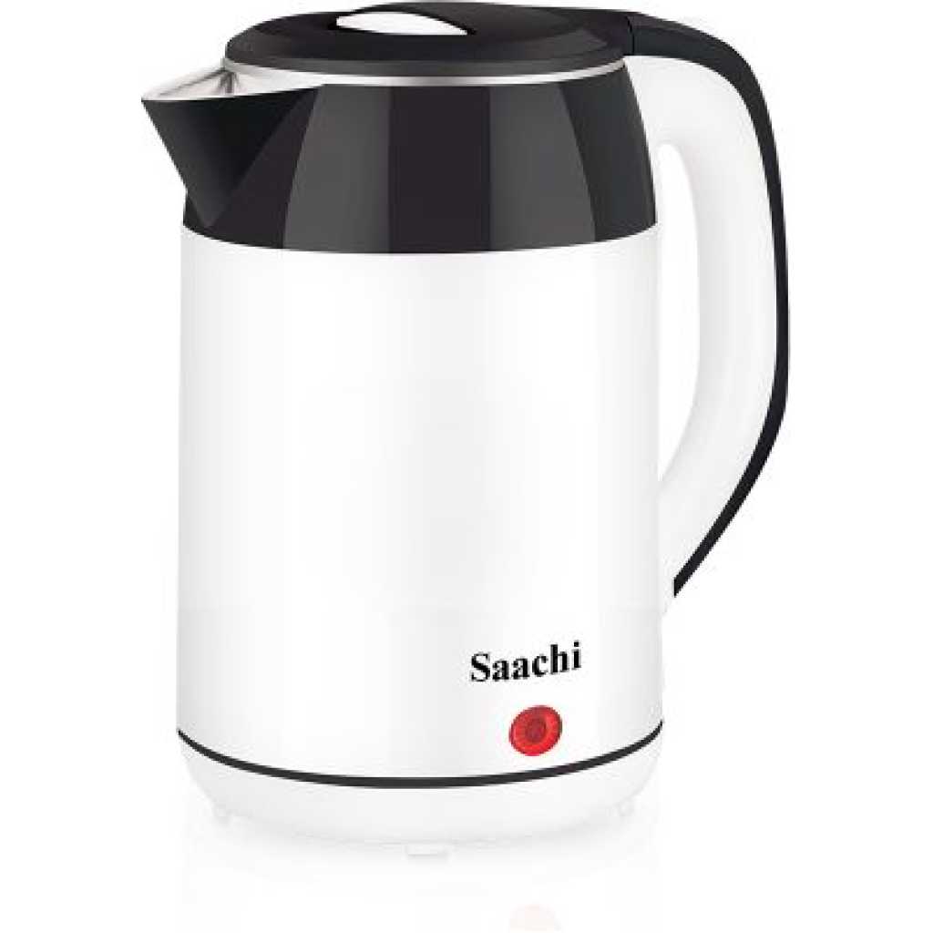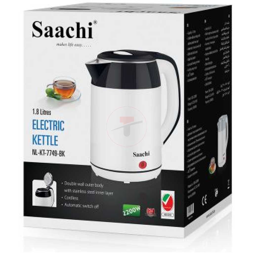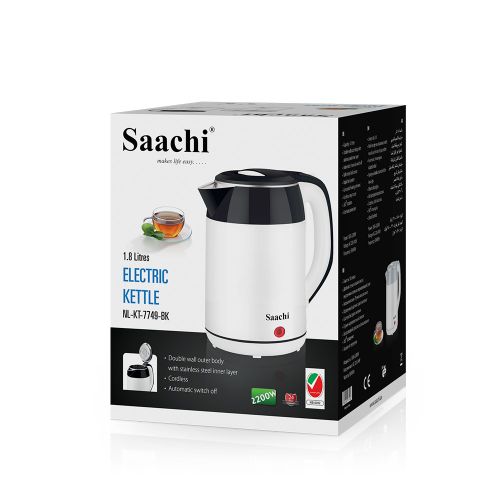 Key Features: Saachi NL-KT-7749 1.8L Electric Kettle – White & Black. 1.8 litres capacity Double wall outer body with stainless steel inner layer Automatic/manual switch off Built in dry-boil sensor Rapid boil system Concealed heating element Cordless, easy to use 360 degree rotation Overheat protection