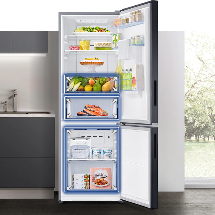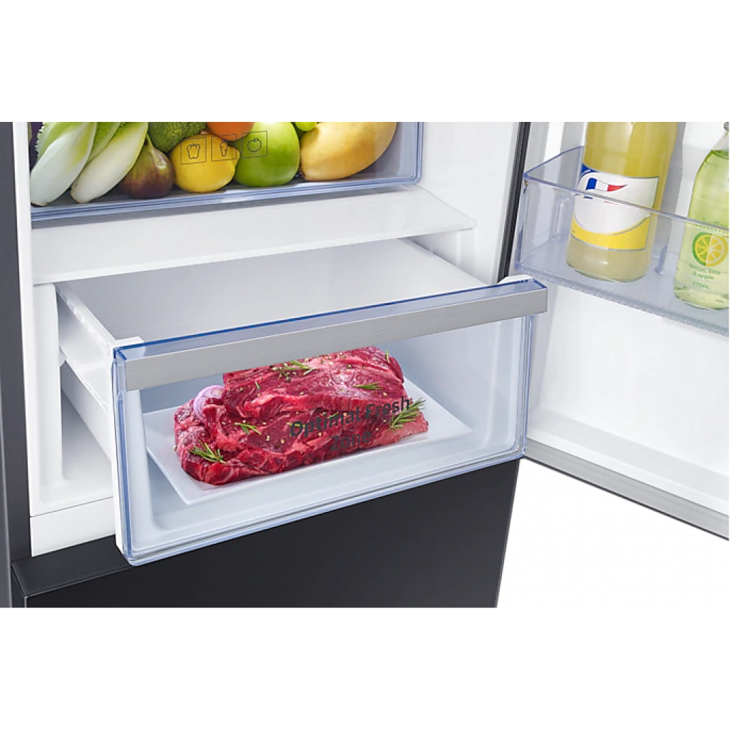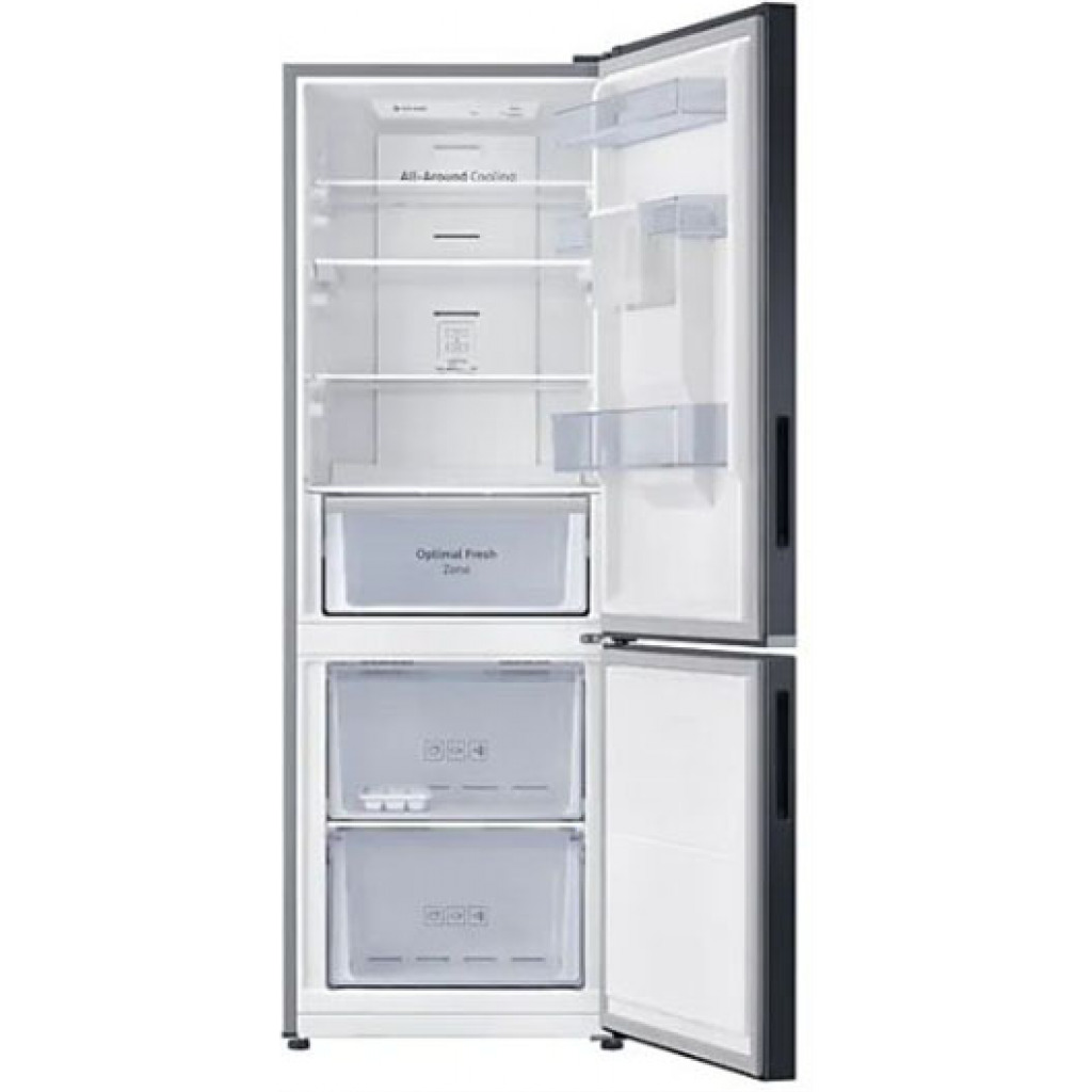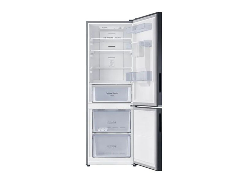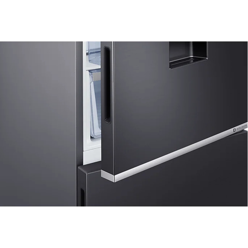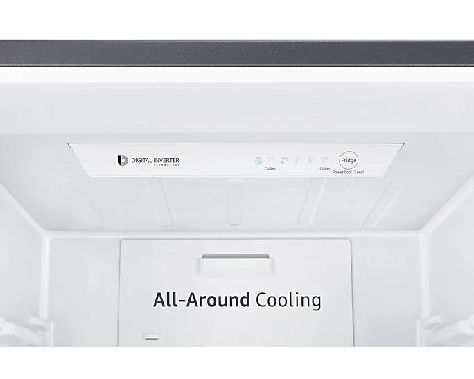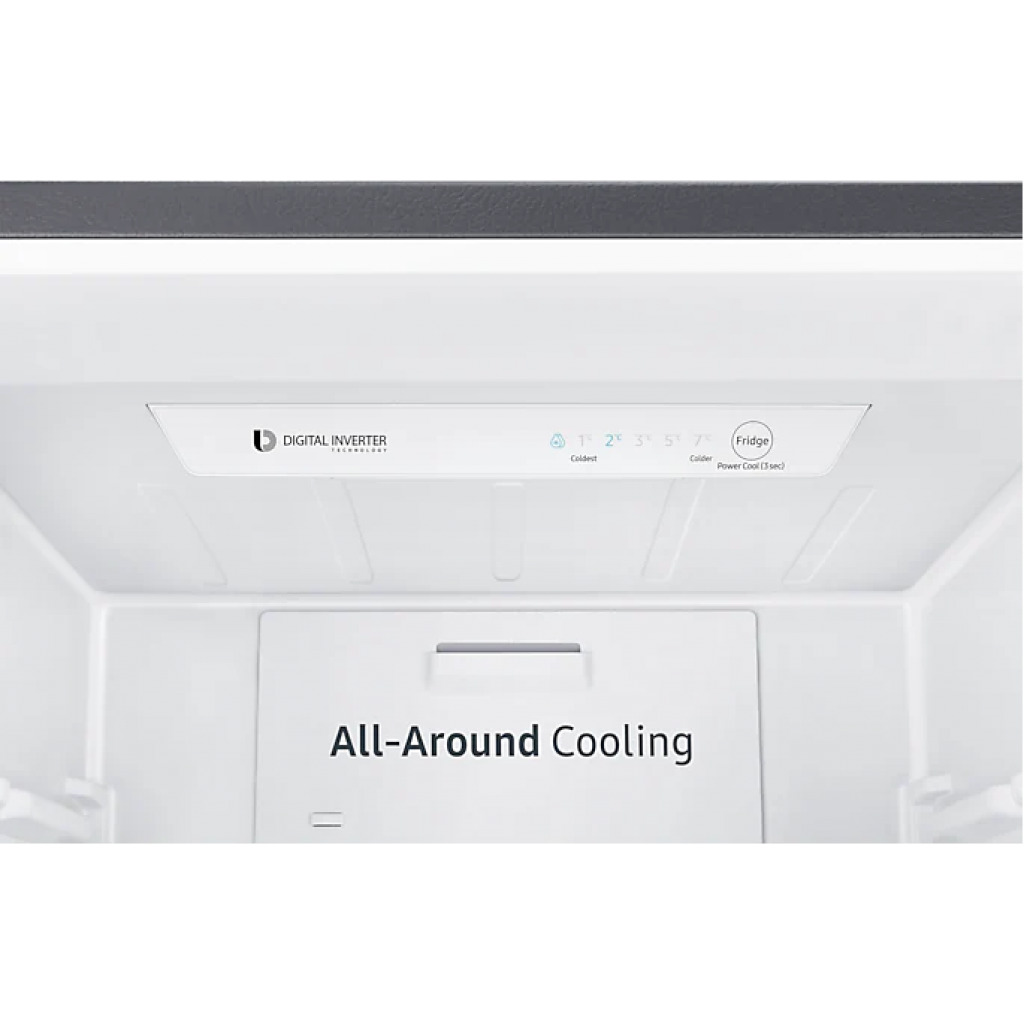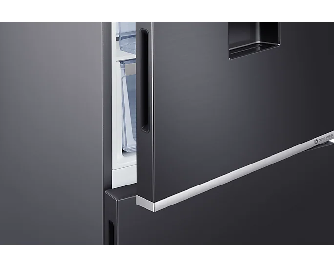 Samsung 370-liter Refrigerator with Dispenser RB37N4160B1 – Double Door Fridge, Bottom Mount Freezer, Frost Free Gross capacity: 370 litres Net Capacity: 290 litres Frost-free Digital inverter compressor Interior LED lighting in fridge compartment Separate freezer temperature control Power cool function Deodorizing filter Tempered glass shelves LED lighting