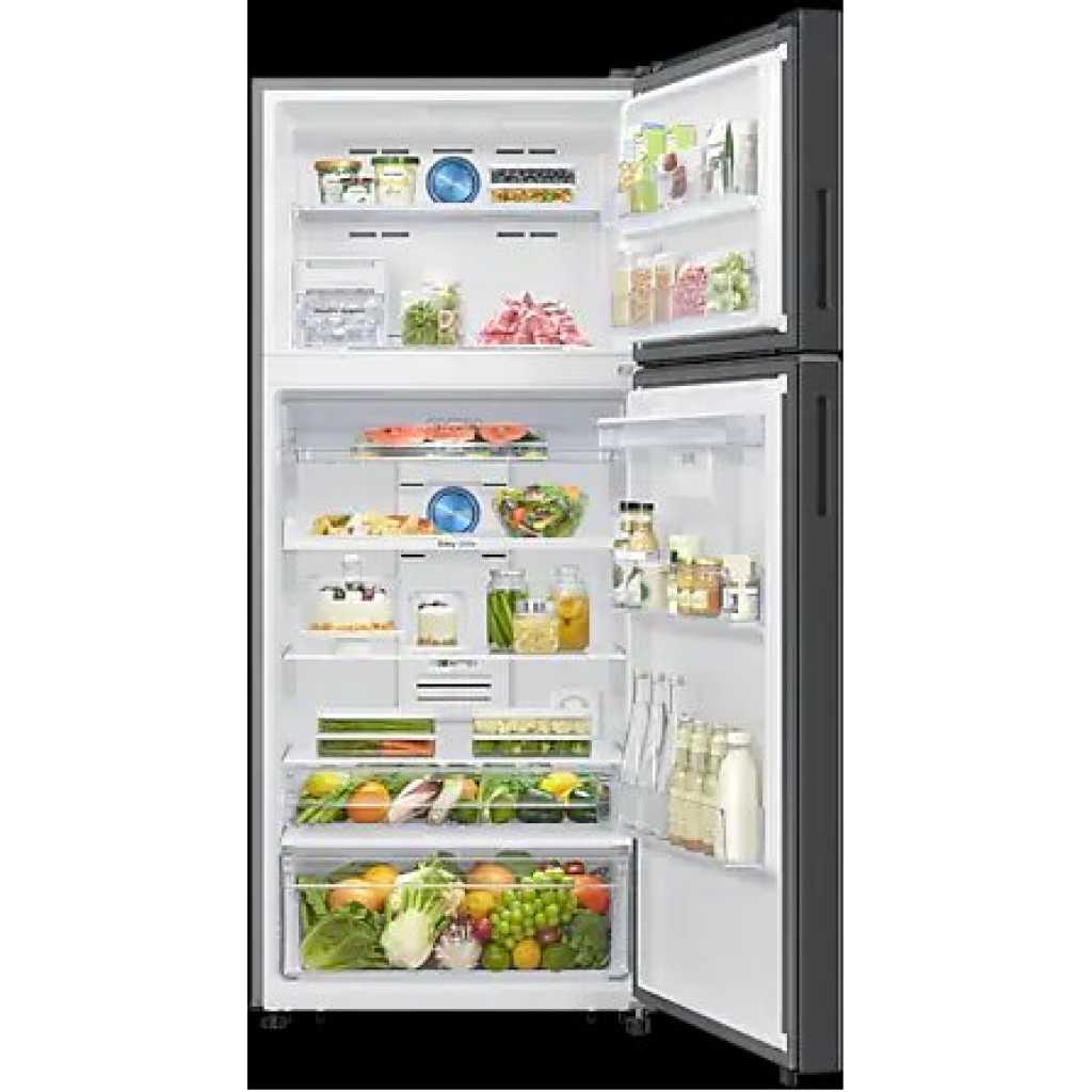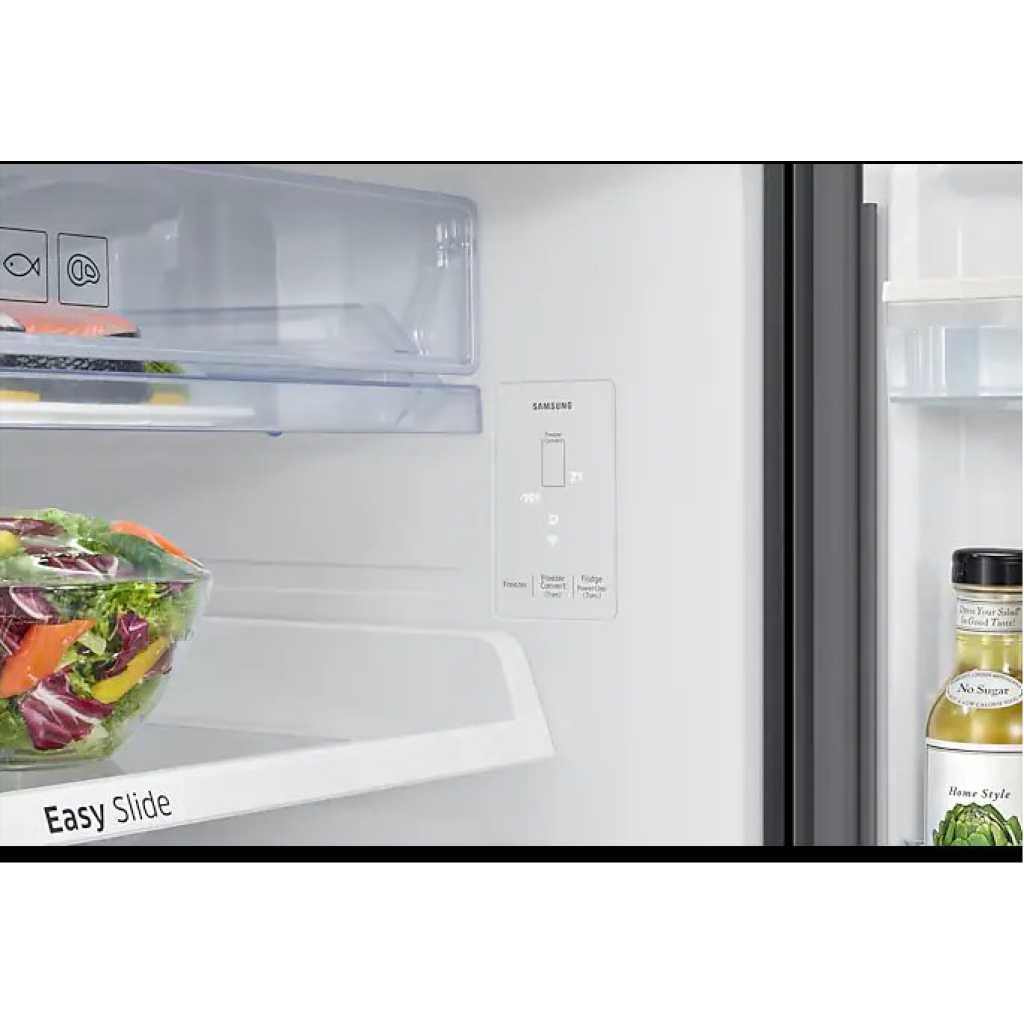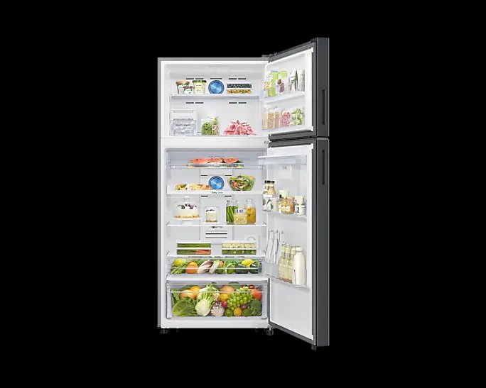 Samsung 528L 3 Star Frost, Top Mount Fridge, RT53DG7B60B1UT SmartThings & AI Energy Saving Mode Manage your energy usage to reduce your carbon footprint and save money. SmartThings Energy* provides energy efficiency tips. It also monitors the energy consumption of appliances** in real-time and compares it to the previous month. * Available on Android and iOS devices. A Wi-Fi connection and a Samsung account are required. ** SmartThings Energy currently works with around 40 Samsung home appliances that are SmartThings enabled. These include refrigerators, washing machines, clothes dryers, dish washers, air conditioners, air purifiers, vacuum cleaners, ovens, hoods, cooktops, microwave ovens, TVs (from June 2022) and energy meters. Twin Cooling Plus™ System Twin Cooling Plus™ technology cools the fridge and freezer compartments separately with two independent cooling systems, creating an optimal environment for keeping food fresh longer with 70% humidity, compared to 30% in a conventional top mount freezer*. Food odours can change the taste of frozen foods and affect the flavors of finished dishes. Twin Cooling Plus™ is a truly independent cooling system, with separate airflows in both the fridge and freezer. * Based on internal testing comparing Samsung models RT22SCSW2 and RT5000K. Active Fresh Filter Keep the fridge clean and hygienic, reducing the risk of food being contaminated. An Active Fresh Filter eliminates 99.99% of harmful bacteria**. ** Witnessed by Intertek. 99.9% of Staphylococcus Aureus and Escherichia Coli. Smart Conversion Enjoy the convenience of having 5 different conversion modes to choose from. Easily convert your freezer into a fridge at a push of a button, ideal for when you need more space to store your fresh food. Or simply switch off the fridge compartment when leaving your home for a long vacation to conserve energy. Power Cool / Power Freeze It blows intensely cold air into the fridge to quickly cool your groceries or favorite drinks. Power Freeze delivers a fast blast of cold air into the freezer, ideal for freezing or firming up frozen food and making ice. Features Spec