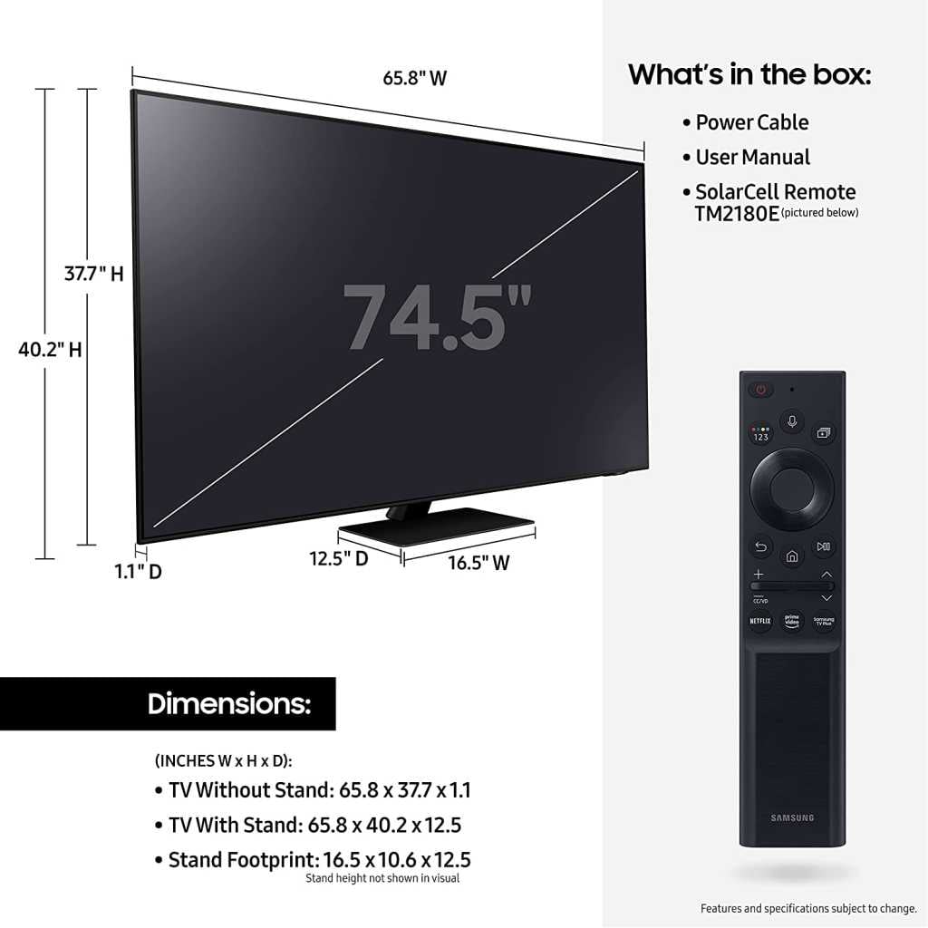 Samsung 75 Inch Neo QLED 4K Smart TV QA75QN85A, Quantum HDR 24x, Dolby Atmos Experience With inbuilt Digital Reciever – Black. QLED TV. Samsung 75″ Smart TV. Inbuilt free-to-air decoder. Picture quality in a league of its own with Quantum Matrix Technology Unleash vivid color with Quantum Dot Picture perfect down to the last detail with Quantum HDR 24x Feel the impact of Object Tracking Sound Quantum Matrix Technology powered by Quantum Mini LED backlighting joins with Quantum HDR24x images and Object Tracking Sound, for a complete sound and vision experience. Quantum Dot technology delivers a world of immersive colors and contrast in a variety of lighting conditions – allowing you to discover details you haven’t before. Experience groundbreaking sound technology that follows objects on the screen. Designed for immersive audio, dedicated up-firing speakers help pull you closer to the action.* Samsung’s Anti-Glare Technology helps you enjoy your TV in a variety of lighting conditions. The stylish NeoSlim design makes this Neo QLED TV the perfect complement to any home. A wide Viewing Angle means almost every seat can be the best seat in the room. Intelligent Mode uses a combination of smart sensors to fine-tune the audio, picture, and brightness so that the action always looks and sounds incredible. Ambient mode+. 4K Neo quantum processor. Resolution: 3,840 x 2,160. Dolby digital plus audio. 60W audio output. 60W 2.2.2ch speakers. Active voice amplifier. Dolby 5.1 Decoder. Multi voice assistant built in. DVB-T(T2 Ready). 4 HDMI ports. 2 USB ports. Digital audio output port (optical). Ethernet port. Bluetooth. 1-year manufacturer warranty. Catch the details you’ve never noticed before with the QN85A. Step into a new era of color and contrast with our most advanced 4K processor and new breakthrough backlighting technology. Enjoy ultra-high contrast that makes your picture stand out and come alive, even in dark or bright scenes. Its Quantum Matrix Technology is game-changing, using an expansive matrix of Quantum Mini LEDs to accurately focus light exactly where it’s needed on screen. And you’ll see all the beauty 4K UHD delivers, with the Neo Quantum Processor 4K transforming what you watch into 4K resolution.* Plus, Quantum HDR 24X enhances content with colors to provide dynamic contrast, while a billion colors leap off the quantum dot display thanks to 100% Color Volume with Quantum Dot.** If you need a gaming TV, optimize how you play with features like Motion Xcelerator Turbo+, which minimizes blurring for a smooth picture up to 4K at 120Hz. You’ll be able to enjoy audio that moves with the action on screen, thanks to Object Tracking Sound. The anti-glare TV screen ensures you get a great view no matter where you sit. Plus, you can enjoy access to apps and streaming services like Netflix, Prime Video and Google TV, as well as connect to your smart home and SmartThings, right from your Samsung smart TV remote. And it’s all easy to get to with Bixby, Alexa, and Google Assistant built-in. The QN75QN85AAFXZA Samsung 75-inch TV measures 12.5 x 65.8 x 40.2 inches. It includes a power cable, SolarCell remote controller, and Samsung smart control. Add the Q Series sound bar for deep, immersive surround sound. *Upscales to 4K Resolution. The resulting picture may vary based on the source content. **QLED televisions can produce 100% Color Volume in the DCI-P3 color space, the format for most cinema screens and HDR movies for television.