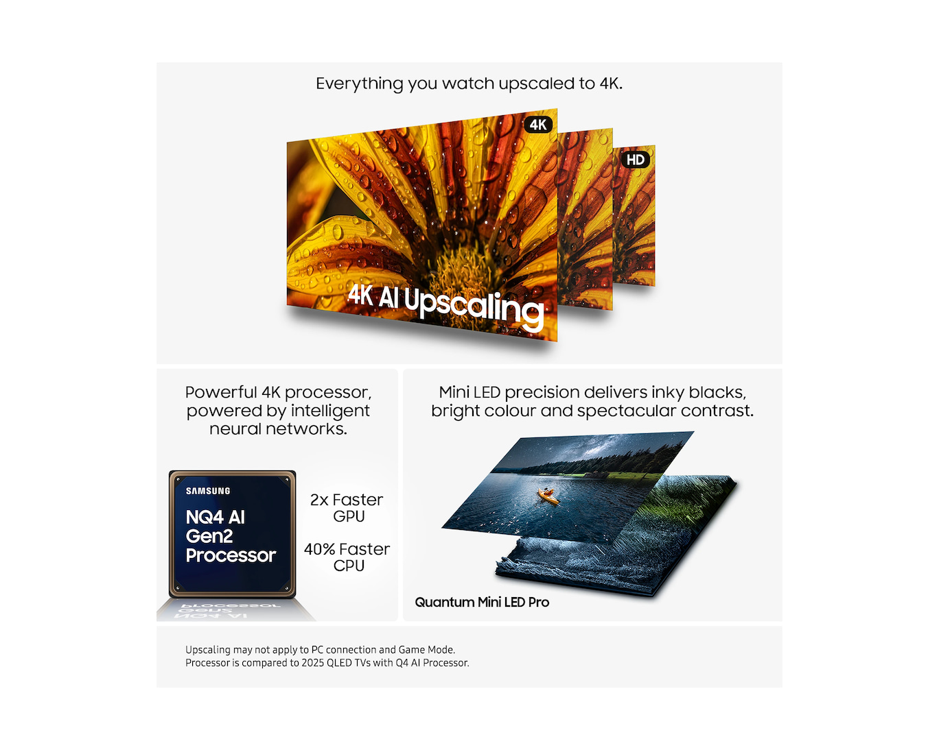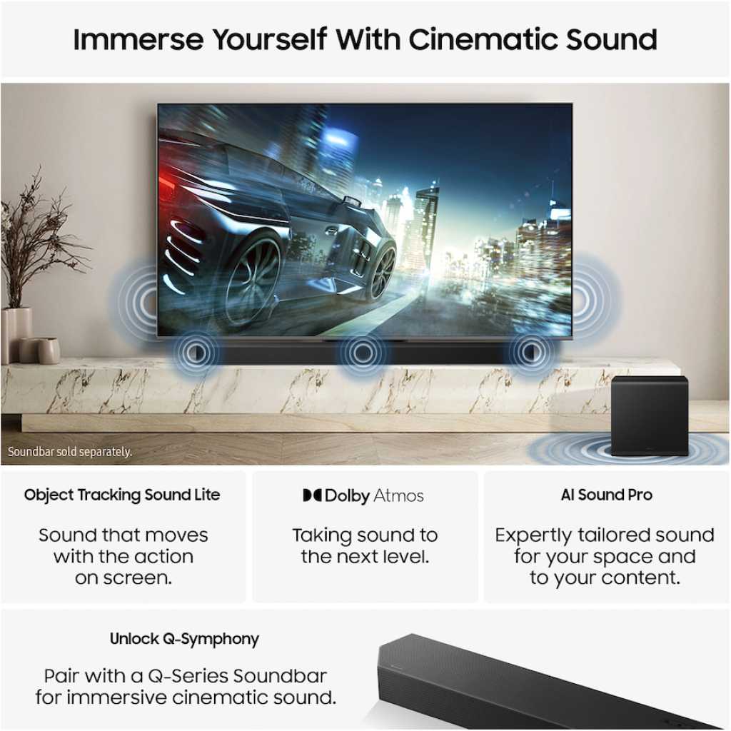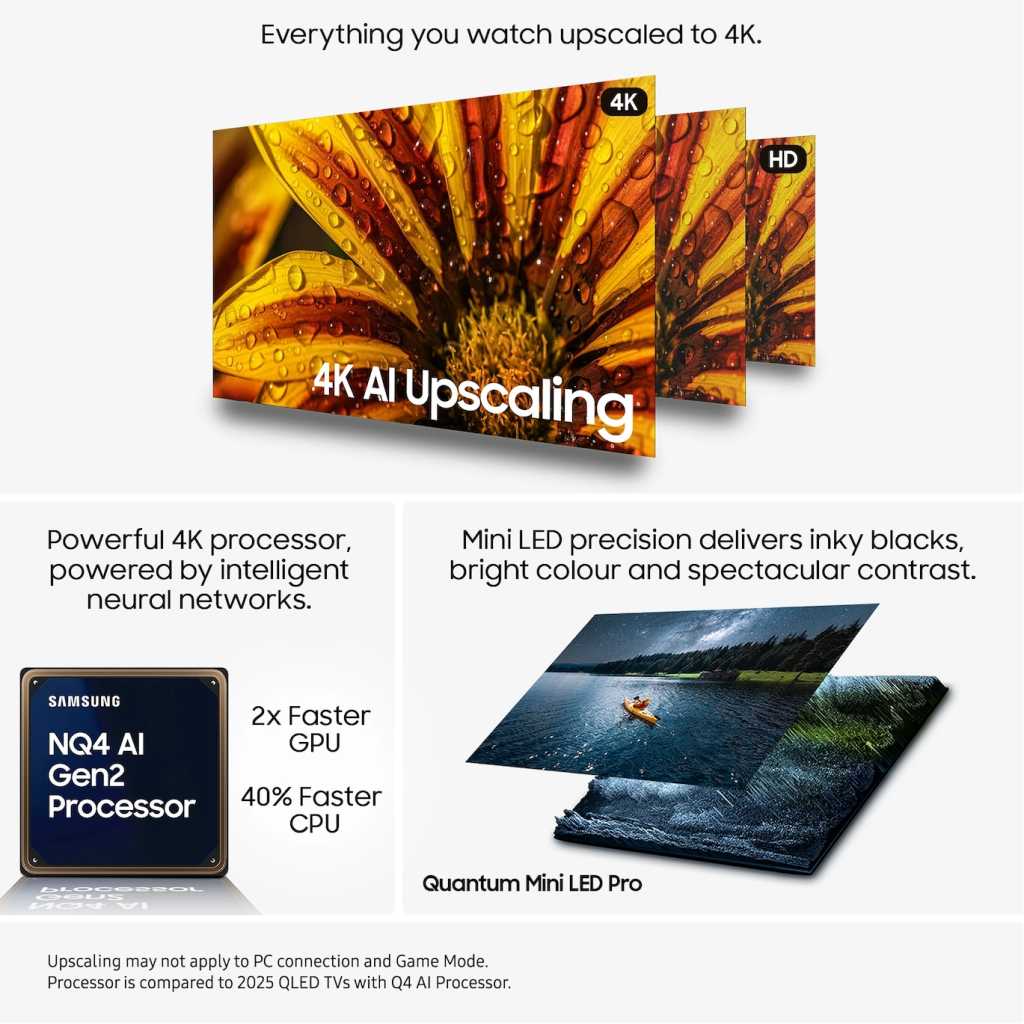 Key Features: NQ4 AI Gen2 PROCESSOR: Feel the full power of AI in 4K. This processor uses the power of 20 AI neural networks to optimize picture and sound quality. The result is superb performance, whether you’re streaming OTT services, playing your favorite video games or watching live sports. QUANTUM MATRIX TECHNOLOGY PLUS: Catch every detail with accurate, ultra-fine light control. Precise control over Quantum Mini LEDs allows you to enjoy great detail in both the darkest and brightest scenes. DOLBY ATMOS: A next level Dolby Atmos experience. Enjoy a next-level surround sound experience that immerses you deep inside the action. With Dolby Atmos, it delivers multi-dimensional audio for unbelievably realistic sound. NEO QUANTUM HDR+: Elevate 4K viewing with superb brightness and vivid colors. Elevate your viewing pleasure with superb brightness and dynamically adaptive scenes in 4K resolution. Neo Quantum HDR+ is up to 2 times brighter than Neo Quantum HDR, delivering a more vivid color experience in a higher dynamic range like none other. PANTONE VALIDATED: Enjoy a full range of authentic colors. As a trusted symbol of color fidelity by industry experts, ‘PANTONE Validated’ certifies the accurate expression of 2,140 PANTONE colors and 110 newly-added skin tone shades. So you can be sure that you’re getting a rich, true-to-life viewing experience.