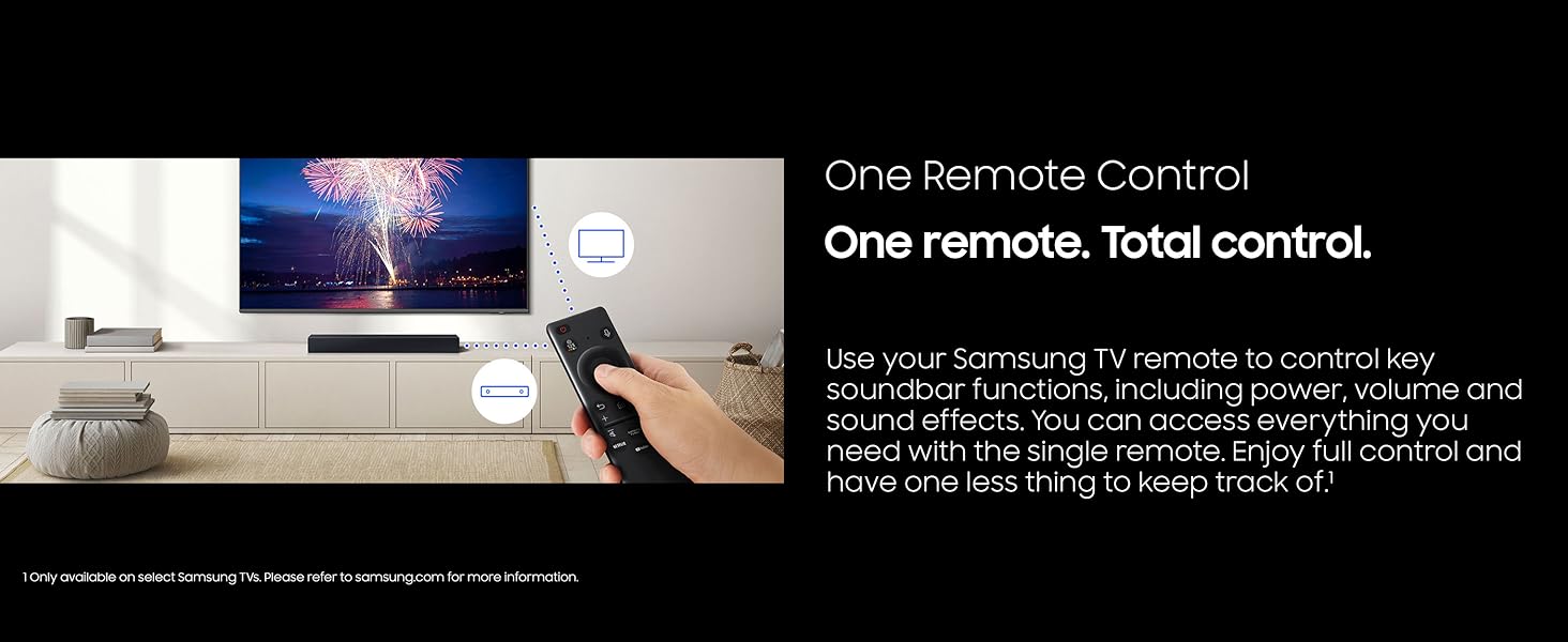 Key Features: FULL, BALANCED SOUND WITH A SUBWOOFER INCLUDED: Immerse yourself in your favorite content with perfectly balanced sound and rich bass from the built-in woofer. ONE REMOTE. TOTAL CONTROL: Use your Samsung TV remote to control key soundbar functions, including power, volume and sound effects. EXPANDS YOUR LISTENING ZONE SO YOU CAN FEEL THE SOUND ALL AROUND YOU: Experience immersive sound that fills the room. Clear audio is projected in all directions so you can feel the action from every angle. SEAMLESSLY CONNECTS TO YOUR TV: Connects to your TV without cable clutter. Just pair and play your favorite content. PICK UP EVERY PIECE OF DIALOGUE: Hear voices more clearly with dialogue automatically amplified so you don’t miss a word. ENJOY YOUR CONTENT – EVEN IF YOUR FAMILY IS ON ‘DO NOT DISTURB’: Lowers the volume and minimizes bass so you can watch TV at any hour without waking up the entire house.