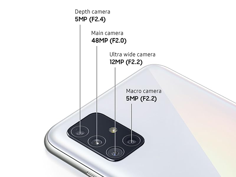 From holiday memories to nights out, Samsung Galaxy A51 lets you capture the world as you see it. An immersive Super AMOLED Infinity-O Display turns switching between social apps and watching videos into a whole new experience. Everything you see is crisp, clear and rich. Samsung Galaxy A51 comes with a powerful 4,000 mAh battery*, giving you the freedom and convenience to share and stream. Dual SIM capability keeps you connected. Add a second SIM card for dual SIM capability perfect for when you’re travelling. *Typical value tested under third-party laboratory condition. Typical value is the estimated average value considering the deviation in battery capacity among the battery samples tested under IEC 61960 standard. Rated (minimum) capacity is 3900mAh for Galaxy A51. Actual battery life may vary depending on network environment, usage patterns and other factors. From the manufacturer Samsung Galaxy A51