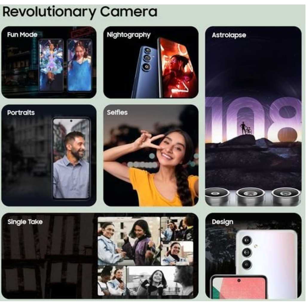 Product Details This website uses cookies. For further information on how we use cookies you can read our Privacy and Cookie notice Description Galaxy F54 108MP camera with Pixel Binning & AI based technology to give brighter, more detailed shots & videos from dusk till dawn. NIGHTOGRAPHY Shoot brilliant shake-free videos with up to 1.5 degree of OIS & 1000Hz of VDIS that works by compensating hand movements. So you get stable, blur-free shots & videos at all times. NO SHAKE CAM Collage, boomerang, or hyper lapse, whatever you love, do everything with just one click. UNIQUE MODES Astro hyperlapse camera mode to capture night lapse videos, and see the magic of the night right on your screen. Play the night on loop Capture stunning selfies with amazing 32MP camera having 4K selfie video and auto night mode. Its auto Frame per second automatically adjusts the frames while shooting in low light. Low light in highlight Glossy flagship design that flaunts out of the world shades in premium metallic sheen. Revolutionary Design OS that offers updates of up to 4 generations and up to 5 years of security updates. OS & SECURITY 16.95cm (6.7”) FHD+ Super Amoled+ 120Hz Display for super immersive entertainment. Plus Eye Comfort Shield for protection against blue light emissions. Revolutionary Entertainment