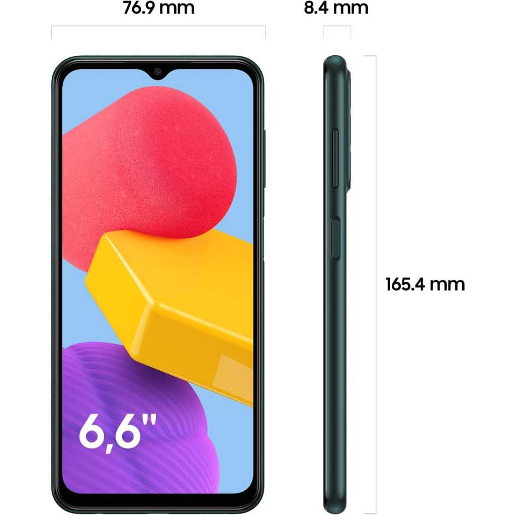Key Features: Samsung Galaxy M13 – 6.6″ 6GB RAM 128GB ROM 50MP 6000mAh – Deep Green. Network Technology: GSM / HSPA / LTE SIM: Dual SIM (Nano-SIM, dual stand-by) Size: 6.6 inches Platform: OS Android 12, One UI Core 4.1 Internal: 128GB 6GB RAM Main Camera: Triple 50 MP Comms: WLAN Wi-Fi 802.11 a/b/g/n/ac, dual-band, hotspot Bluetooth: 5.0, A2DP, LE USB: USB Type-C 2.0 Battery: Type Li-Po 6000 mAh, non-removable