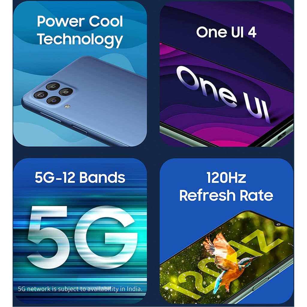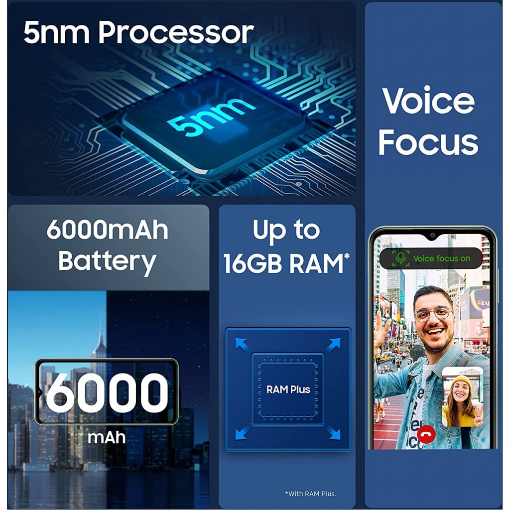 Key Features: Exynos 1280 Octa Core 2.4GHz 5nm Processor with the 12 band support for a True 5G experience 16.72 centimeters (6.6-inch) LCD Display, FHD+ resolution, 1080×2400 pixels protected by Gorilla Glass 5 Versatile Quad camera setup-50MP (F1.8)+ 5MP (F2.2/UW- 123 FOV) + 2MP (F2.4/Depth) + 2MP (F2.4/Macro) QuadCamera| 8MP (F1.8) Front Camera Massive 6000 mAh Battery | Memory, Storage & SIM: 8GB RAM | 128GB internal memory expandable up to 1TB| SIM 1 + SIM 2+ Micro SD Latest Android v12.0, One UI 4 operating system. Intelligent Voice Focus | Power Cool Technology | Auto Data Switching Connector type: 3.5mm jack