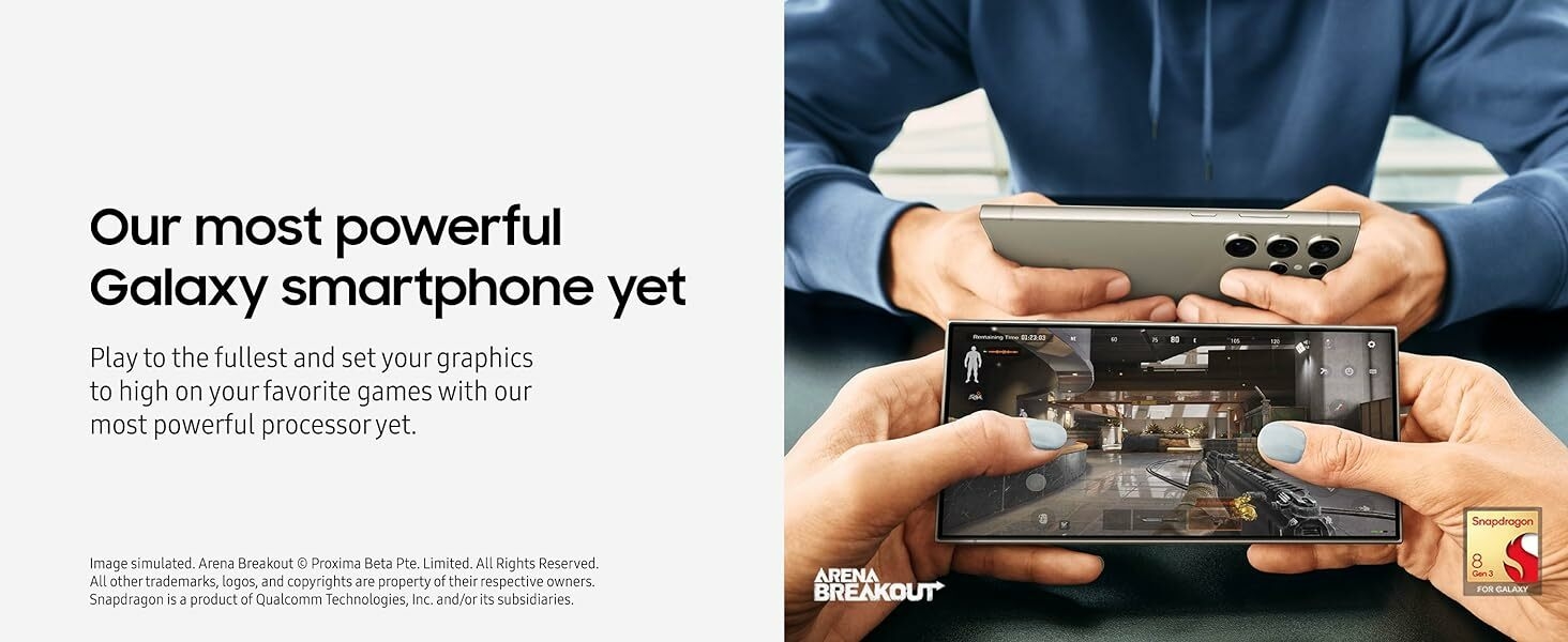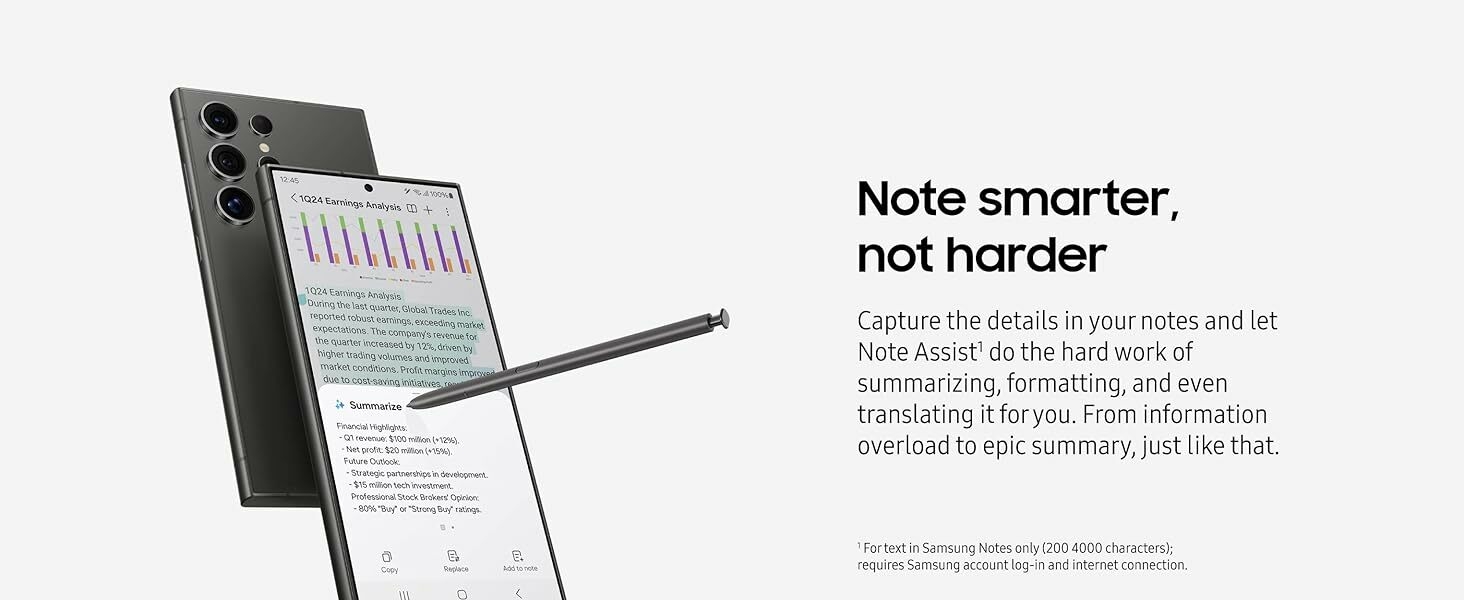 Samsung Galaxy S24 Ultra 6.8" 12GB RAM 1TB ROM 200MP 5000mAh - Titanium Grey NETWORK Technology: GSM / CDMA / HSPA / EVDO / LTE / 5G SIM: Dual SIM (2 Nano-SIMs and eSIM, dual stand-by) Stylus (Bluetooth integration, accelerometer, gyro) Size: 6.8 inches, 113.5 cm2 (~88.5% screen-to-body ratio) PLATFORM: OS Android 14, One UI 6.1 Internal: 1TB 12GB RAM MAIN CAMERA: Quad 200 MP COMMS: WLAN Wi-Fi 802.11 a/b/g/n/ac/6e/7, tri-band, Wi-Fi Direct Bluetooth: 5.3, A2DP, LE USB: USB Type-C 3.2, OTG BATTERY Type: Li-Ion 5000 mAh, non-removable