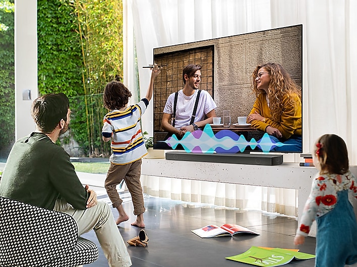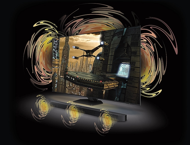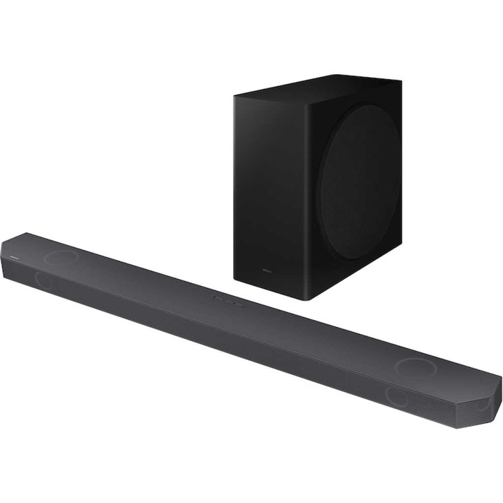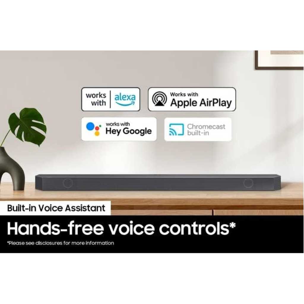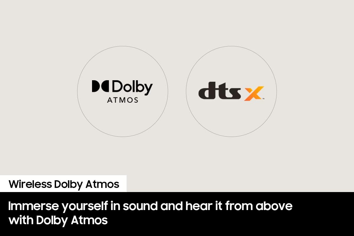 Sound comes alive with the Q800B soundbar without the need for HDMI cables thanks to Wireless Dolby Atmos. 5 channels, 1 subwoofer and 2 channels combine to create sound effects as the director intended with immersive acoustic technology. The Q800B also synchronizes with all of the speakers from your compatible Samsung TV to create rich, multi-layered audio with Q-Symphony. Sound is automatically optimized to fit their surroundings with SpaceFit Sound. Plus, you can even play music, hear the forecast, and customize content via voice commands to Alexa with Built-In Voice Assistant. Play your music, videos or podcasts from your mobile device to your soundbar with a simple tap.****** Hear dialogue and commentary loud and clear when it counts the most and never miss an important moment. Active Voice Analyzer breaks down room noise so that onscreen voices are always optimized, making movies and sports more enjoyable. *Q-Symphony is compatible with select 2020 – 2022 Samsung TVs. Please refer to samsung.com for more information. Soundbar must be connected to TV via HDMI to enable Q-Symphony function. **SpaceFit Sound built-in. Please refer to samsung.com for more information. ***Content Services may vary by region & are subject to change without notification. Amazon, Alexa, and all related logos are trademarks of Amazon.com, Inc. or its affiliates. ****This Samsung Soundbar supports AirPlay2 and requires iOS 11.4 or later. Apple, and AirPlay are trademarks of Apple Inc., registered in the U.S. and other countries. *****Compatible with select TVs and select gaming consoles (e.g. Xbox X, PS5). Game console sold separately. ******Tap sound is only compatible with select Samsung mobile devices, with Android 8.1 and above. Tap Sound requires SmartThings app to activate and set up. This service only works when Soundbar and mobile are on. Ultimate sound immersion with side firing speakers