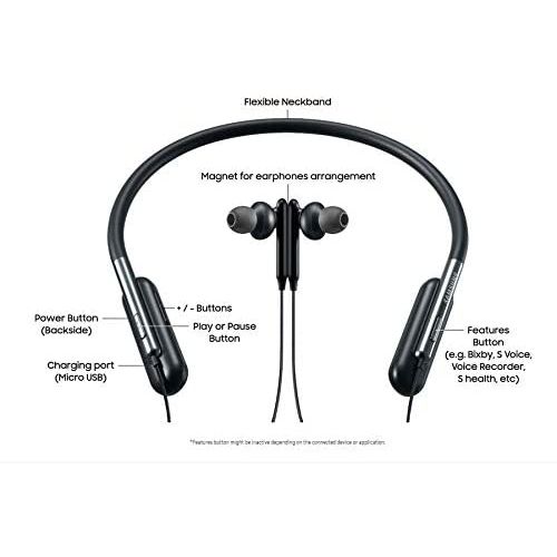 Key Features: Flexible neckband design for comfortable long-term wear and compact storage* Dual-speaker design including 11mm and 8mm speaker units delivers exceptional audio quality Improved Bluetooth connectivity** Active Key initiates voice listening allowing you to connect to the Bixby intelligent interface or other digital personal assistants Battery life allows up to 9 hrs. Talk / 10 hrs. Play / 250 hrs. Standby