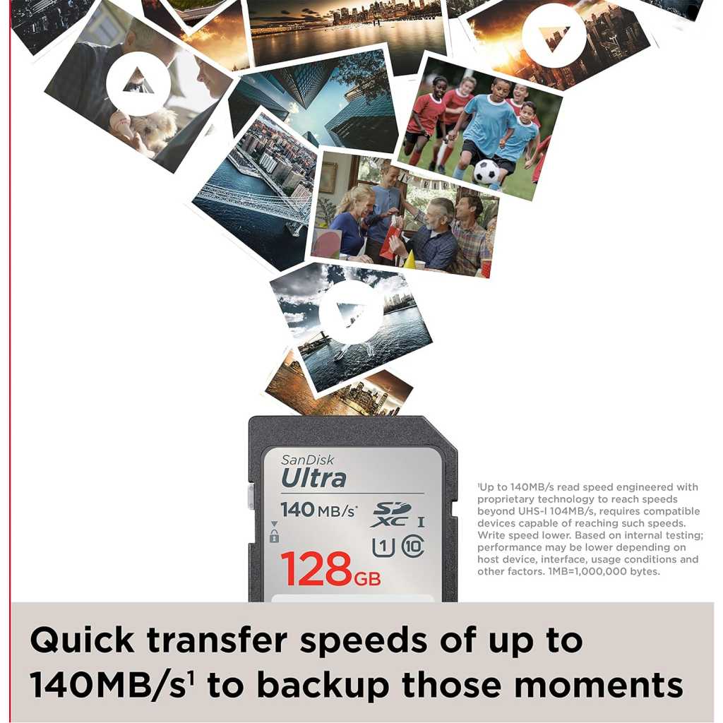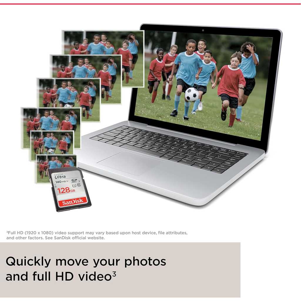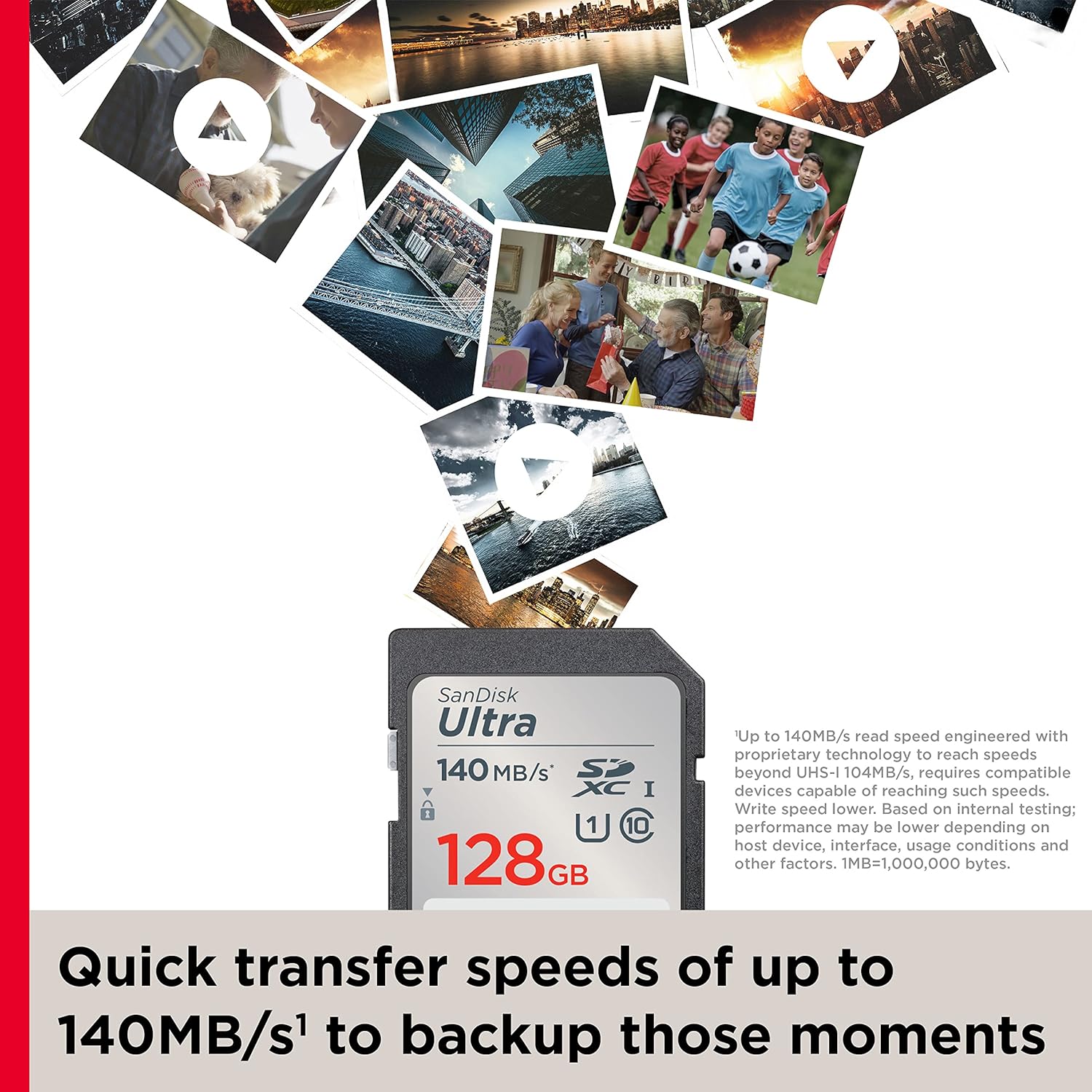 Great choice for compact to mid-range point-and-shoot cameras Quick transfer speeds up to 140MB/s (Up to 140MB/s read speed engineered with proprietary technology to reach speeds beyond UHS-I 104MB/s, requires compatible devices capable of reaching such speeds. Based on internal testing; performance may be lower depending on host device, interface, usage conditions and other factors. 1MB=1,000,000 bytes.) Up to 128GB to store tons of pictures (1GB=1,000,000,000 bytes. Actual user storage less.) Exceptional video recording performance with UHS Speed Class 1 (U1) Class 10 rating for Full HD video (1080p) (UHS Speed Class 1 (U1) designates a performance option designed to support real time video recording with UHS enabled host devices. See consumers speed page on SanDisk site. Full HD (1920×1080) video support may vary based upon host device, file attributes, and other factors. Visit the SanDisk Video Knowledge Base for more information.)