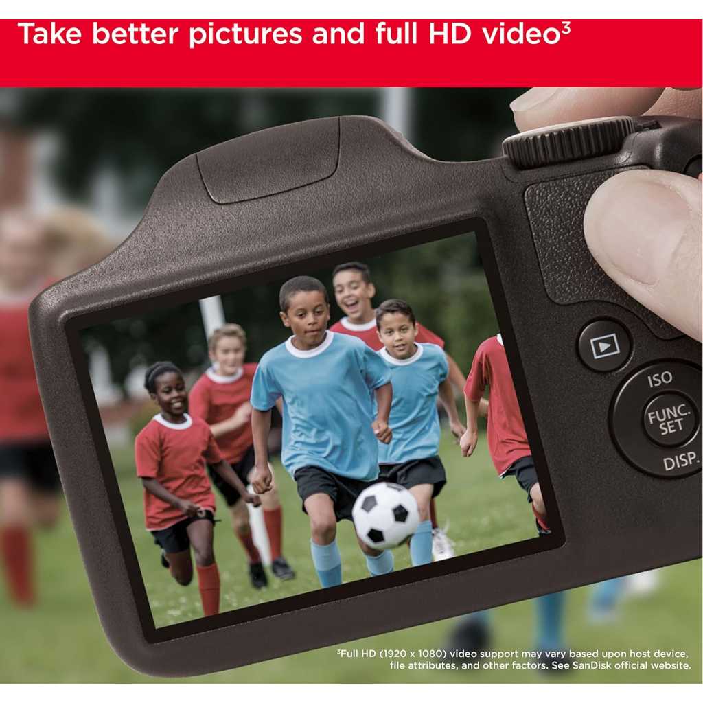 Key Features: Great choice for compact to mid-range point-and-shoot cameras Quick transfer speeds up to 140MB/s (Up to 140MB/s read speed engineered with proprietary technology to reach speeds beyond UHS-I 104MB/s, requires compatible devices capable of reaching such speeds. Based on internal testing; performance may be lower depending on host device, interface, usage conditions and other factors. 1MB=1,000,000 bytes.) Up to 128GB to store tons of pictures (1GB=1,000,000,000 bytes. Actual user storage less.) Exceptional video recording performance with UHS Speed Class 1 (U1) Class 10 rating for Full HD video (1080p) (UHS Speed Class 1 (U1) designates a performance option designed to support real time video recording with UHS enabled host devices. See consumers speed page on SanDisk site. Full HD (1920×1080) video support may vary based upon host device, file attributes, and other factors. Visit the SanDisk Video Knowledge Base for more information.)