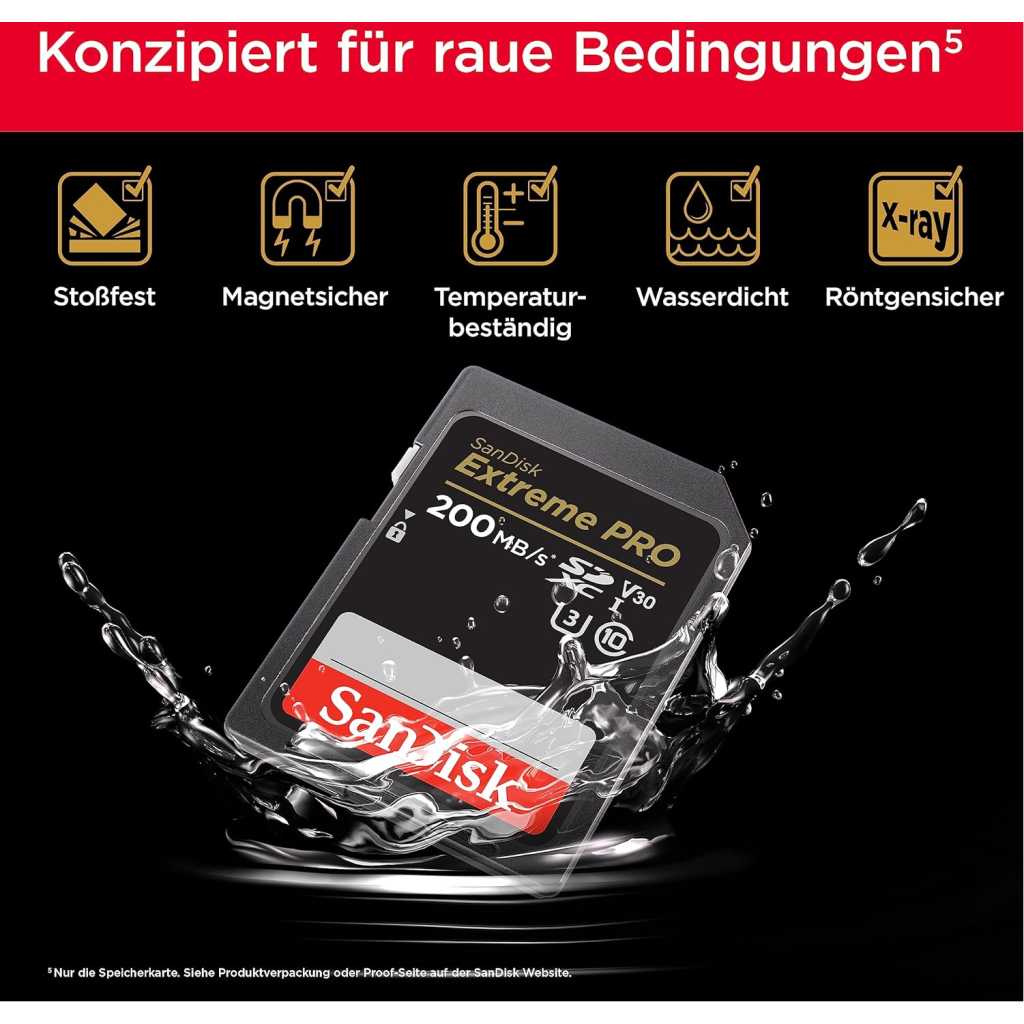 Box contents: SanDisk Extreme PRO SDXC UHS-I memory card 256 GB (V30, transfer speed 200 MB / s, U3, 4K UHD videos, SanDisk QuickFlow technology, temperature resistant) Make lossless 4 K UHD video recordings thanks to UHS Speed Class 3 (U3) and Video Speed Class 30 (V30) with the SD card for camera Professional performance for fast recording and 4K UHD videos with the SanDisk memory card; included is 2 years of use of the RescuePRO Deluxe software to restore accidentally deleted images Thanks to the SanDisk QuickFlow technology and fast transfer of up to 200 MB/s, you no longer wait for your files to be transferred to your SD card or from the SD card to the computer The SDXC memory card is designed for extreme conditions and is before temperature-resistant, waterproof, shockproof and X-ray proof