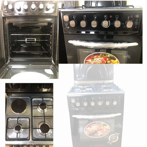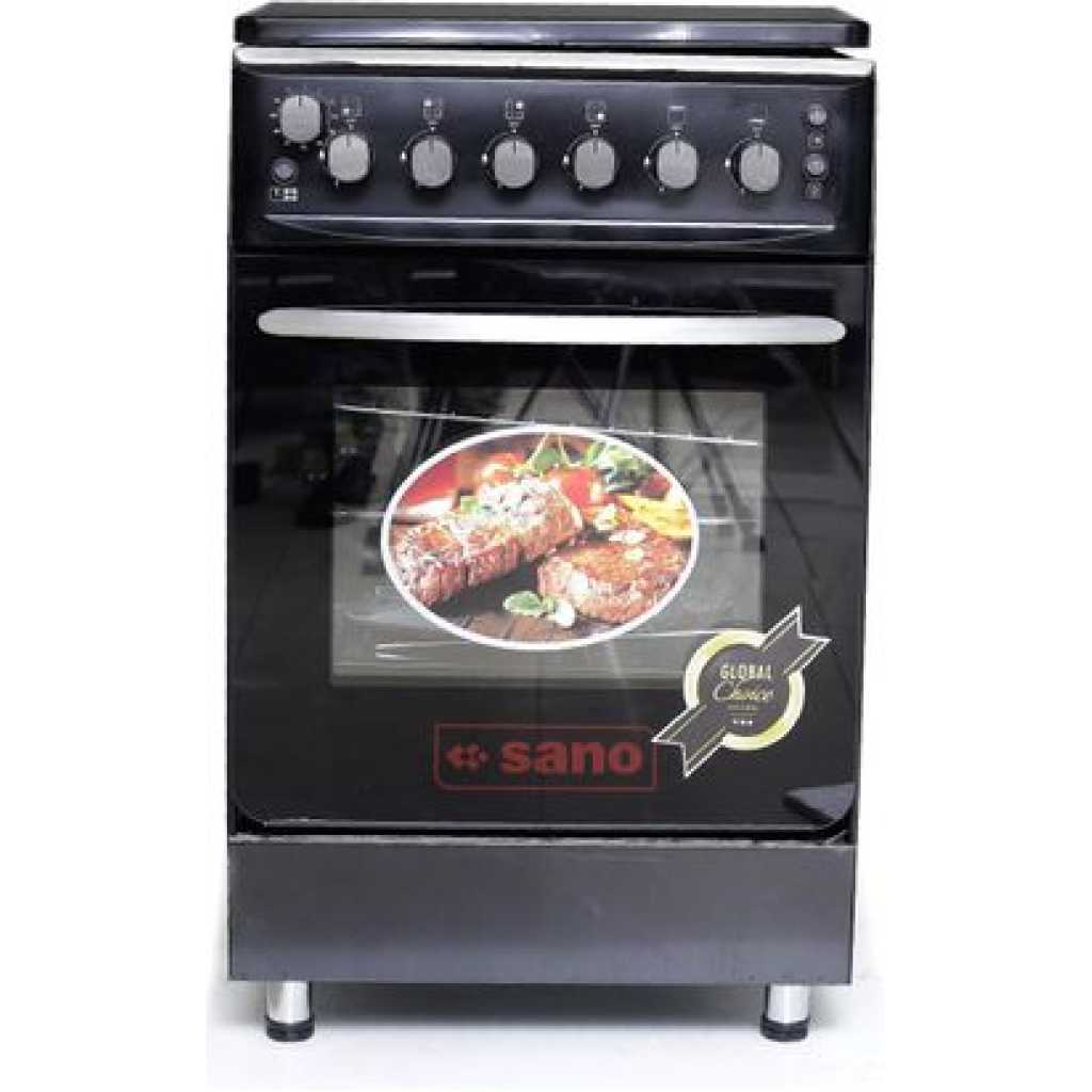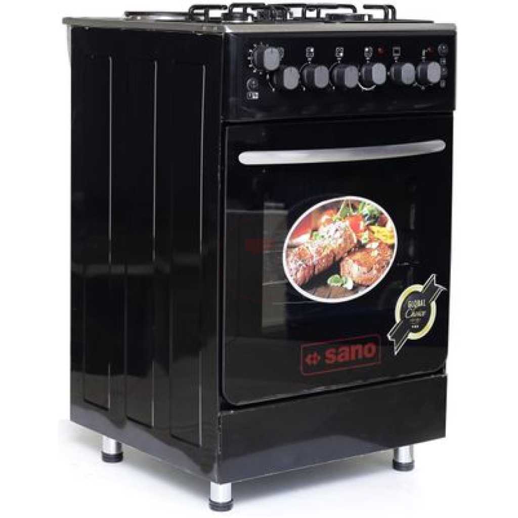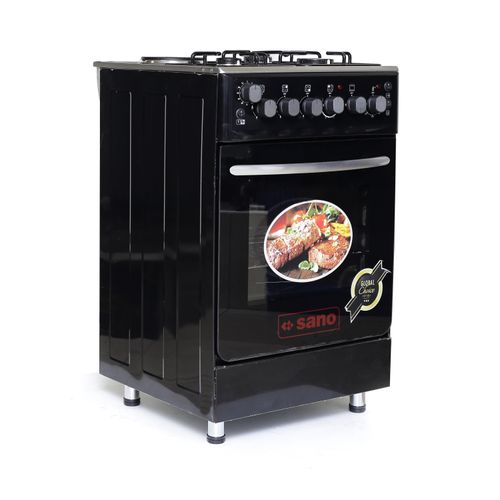 Key Features: Sano 55X55 3 Gas 1 Electric Cooker; Electric Oven & Grill, Rotisserie, Auto Ignition, Timer, 2 Oven Trays – Black. 3 gas burners 1 Hot plate Rotisserie Double electric oven Timer Ignition Oven Lamp Temperature control Double glass oven door Adjustable stands Grill 2 oven trays Stainless steel top and body Black 2 YEARS GUARANTEE AND 3 YEARS WARRANTY.