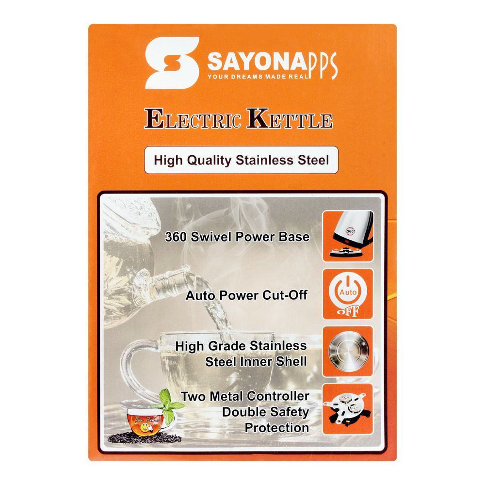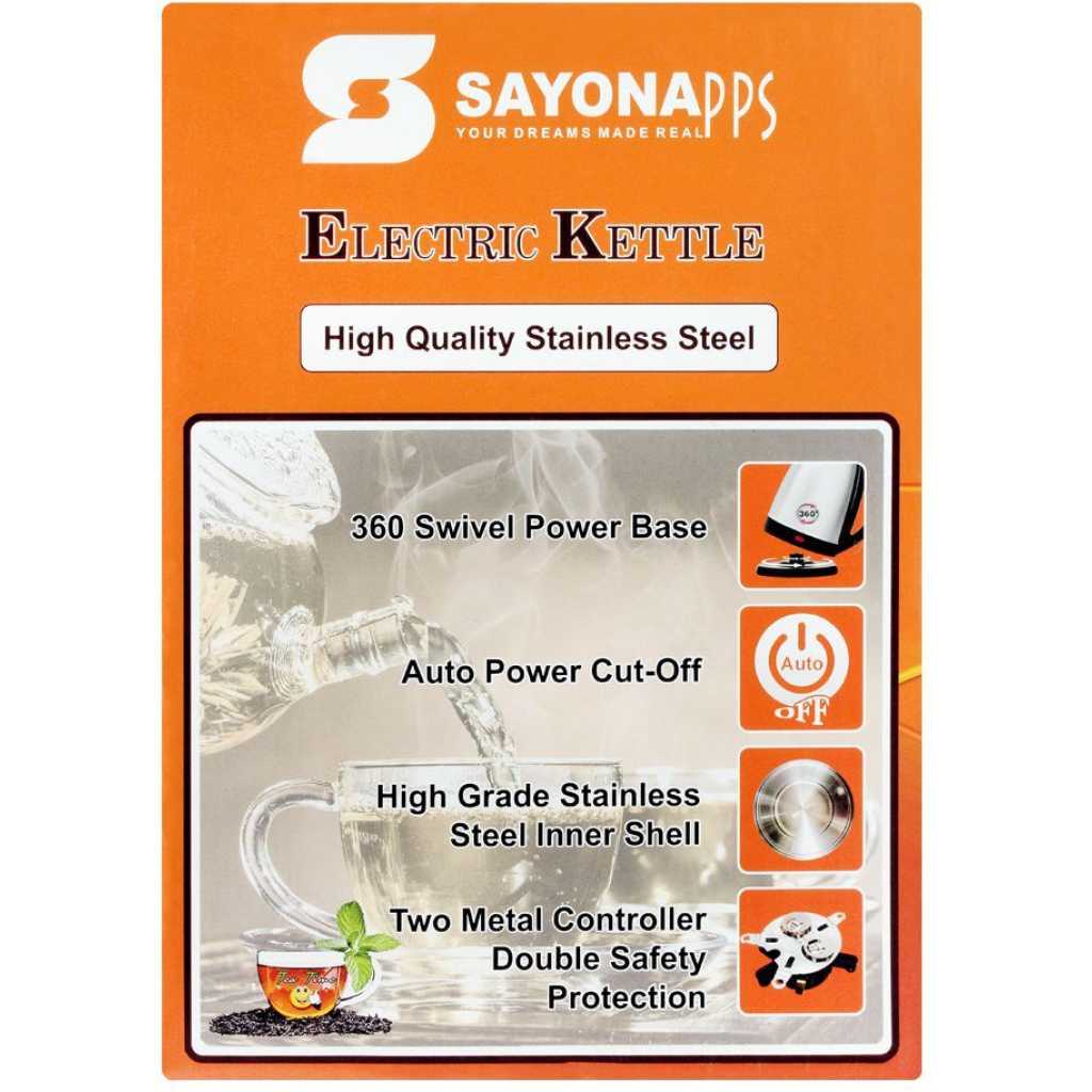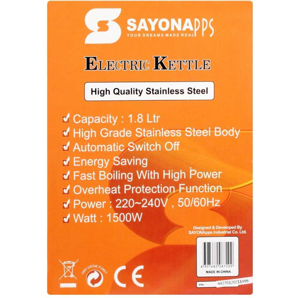 Sayona Electric Kettle, 1.8L, 1500W, SK-4427 – Stainless Steel. This Cordless Portable kettle boils water, fast, saving you precious time. It automatically shuts off, once the water reaches its boiling point. Made from rust-free, Food-Grade Stainless Steel. The ergonomically designed spout, allows you to pour out contents with ease without creating drips.