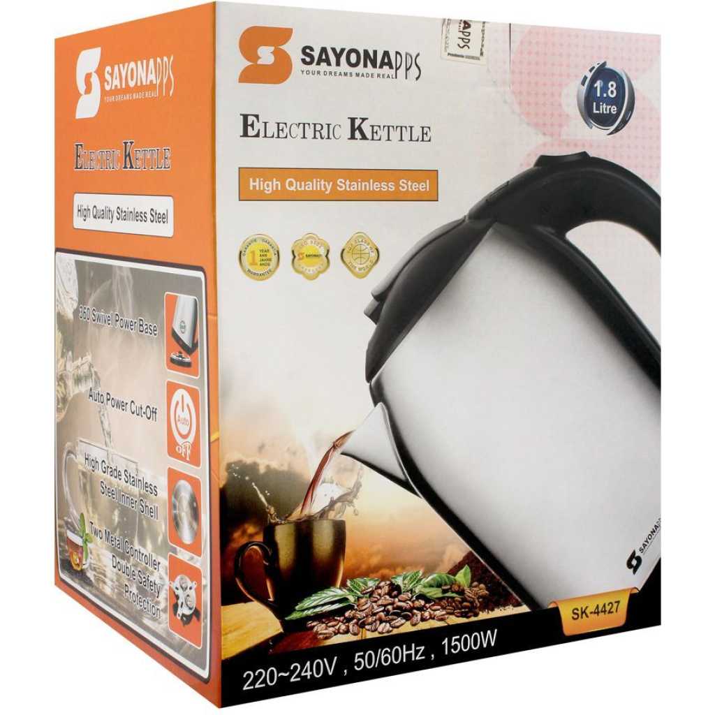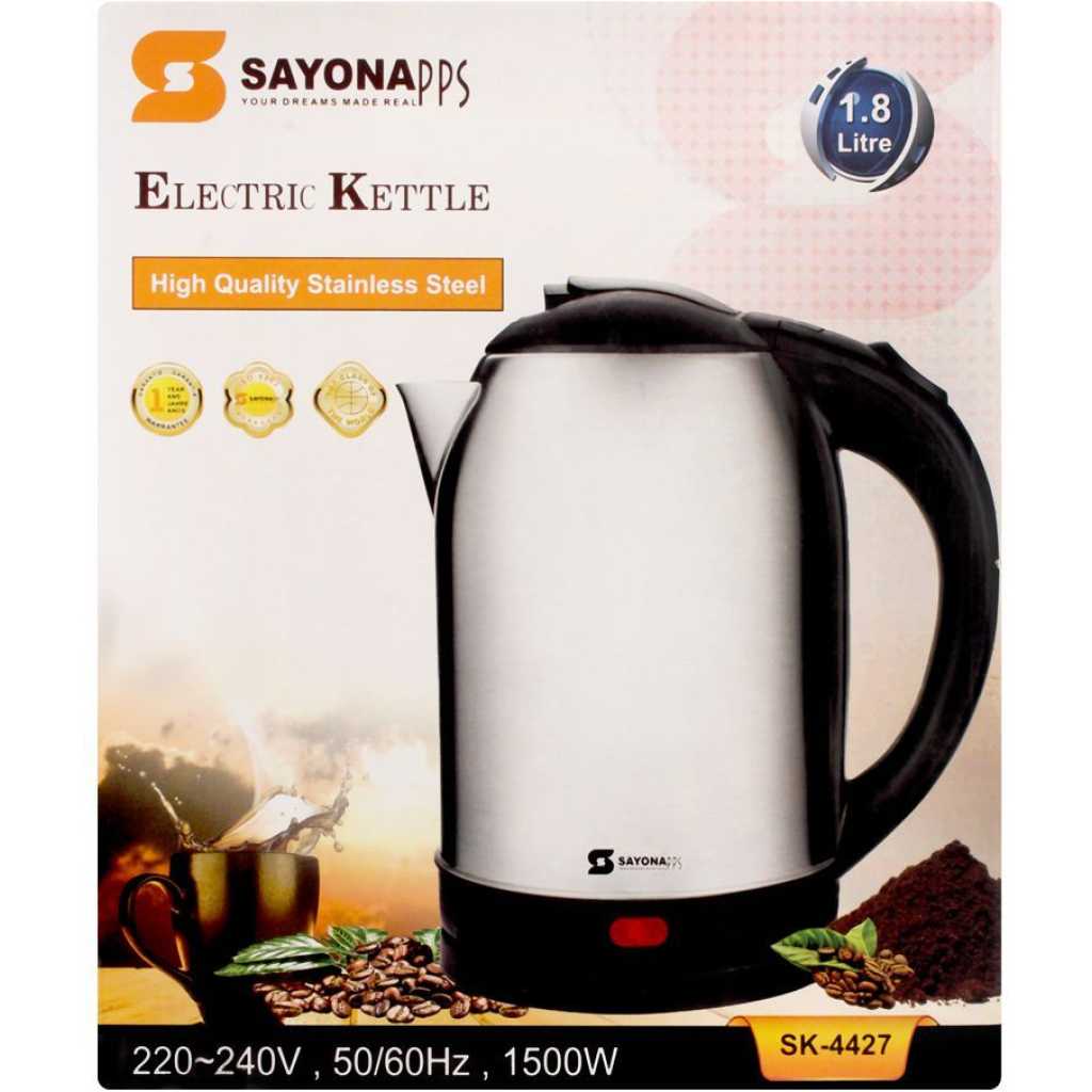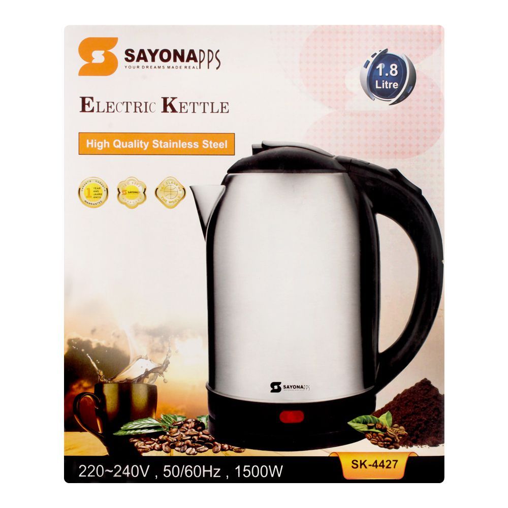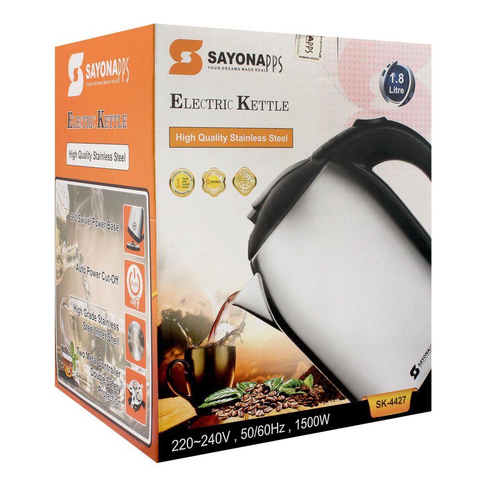 Key Features: Sayona Electric Kettle, 1.8L, 1500W, SK-4427 – Stainless Steel. Brand: Sayona. Model: SK-4427. 1.8L S/S Kettle. 1500 Watt. Cordless. Stainless steel.