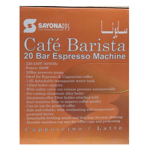 Key Features: 15 bar pressure pump • Ideal for espresso & cappuccino coffee • 1.6 Liter detachable transparent water tank • 150ML boiler capacity • With safety valve can release pressure automatically • Die-casting aluminum alloy boiler • Aluminum alloy filter holder attached with dual stainless filter to improve coffee • Can be used for grinded coffee or pods • Safe and reliable, with overheating and overpressure protected device • Detachable frothing nozzle and drip tray foe easy cleaning • Durable stainless cup mat for coffee cups preheating