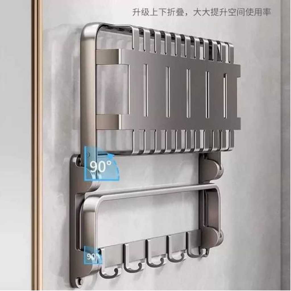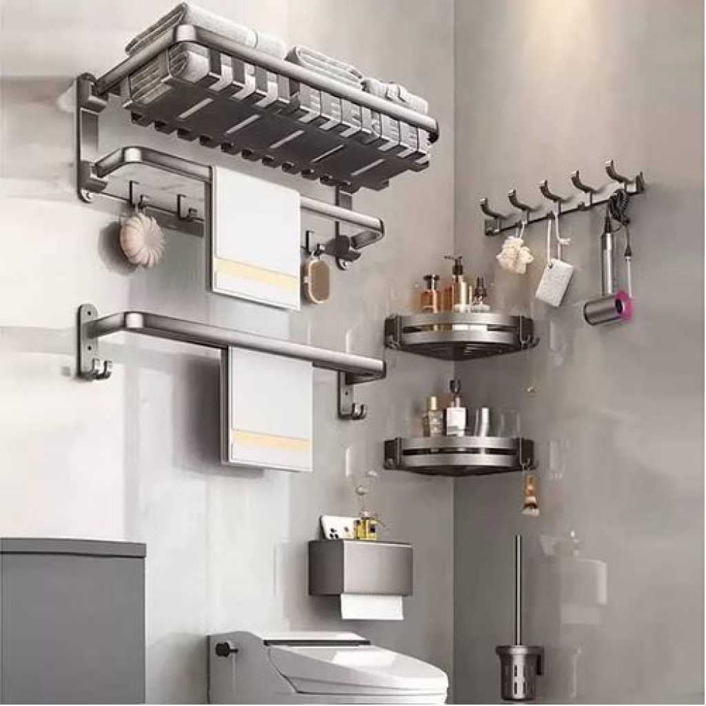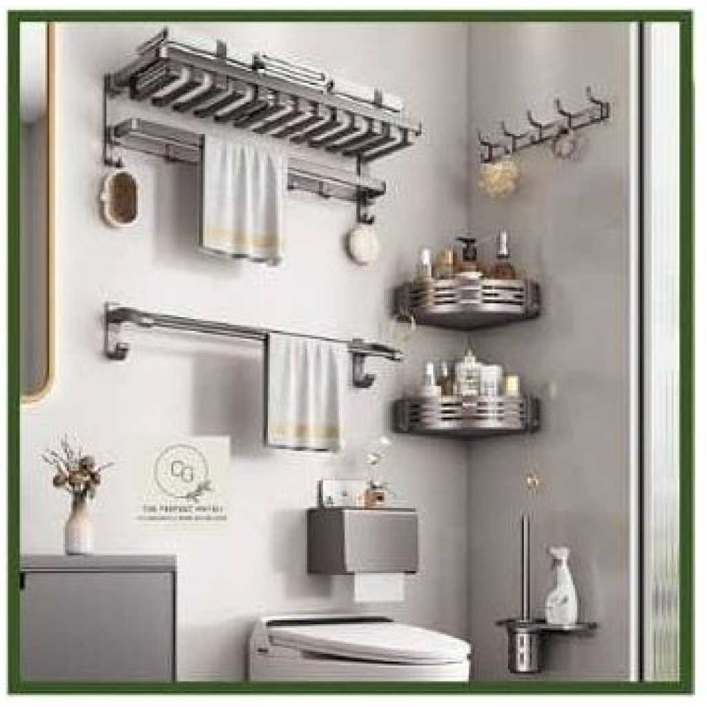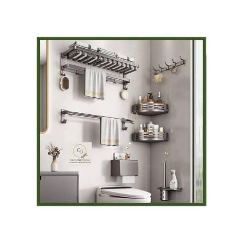 KK5 Bathroom Towel Rack Shelves Set of 6 – Foldable Towel Holder with Towel Bar & 9 racks for Shower Room Organizer Bathroom Storage Kitchen Towels Bathrobes Shower Caddy Brush Space Aluminum Wall Mount What You Get 1* Towel Shelf Basket 1* Towel Bar (Double rods) 2* Square Shower Corner Shelves 1* Toilet Brush with Holder 1* Toilet Paper Holder 1* Over the Door Holders Installation Accessories Features 1 Shower Caddy with Towel Bar 2 Aluminum Alloy shower caddy 3 Wall mounted Towel shelf 4 Large capacity shower caddy 5 Modern design bathroom shower shelf