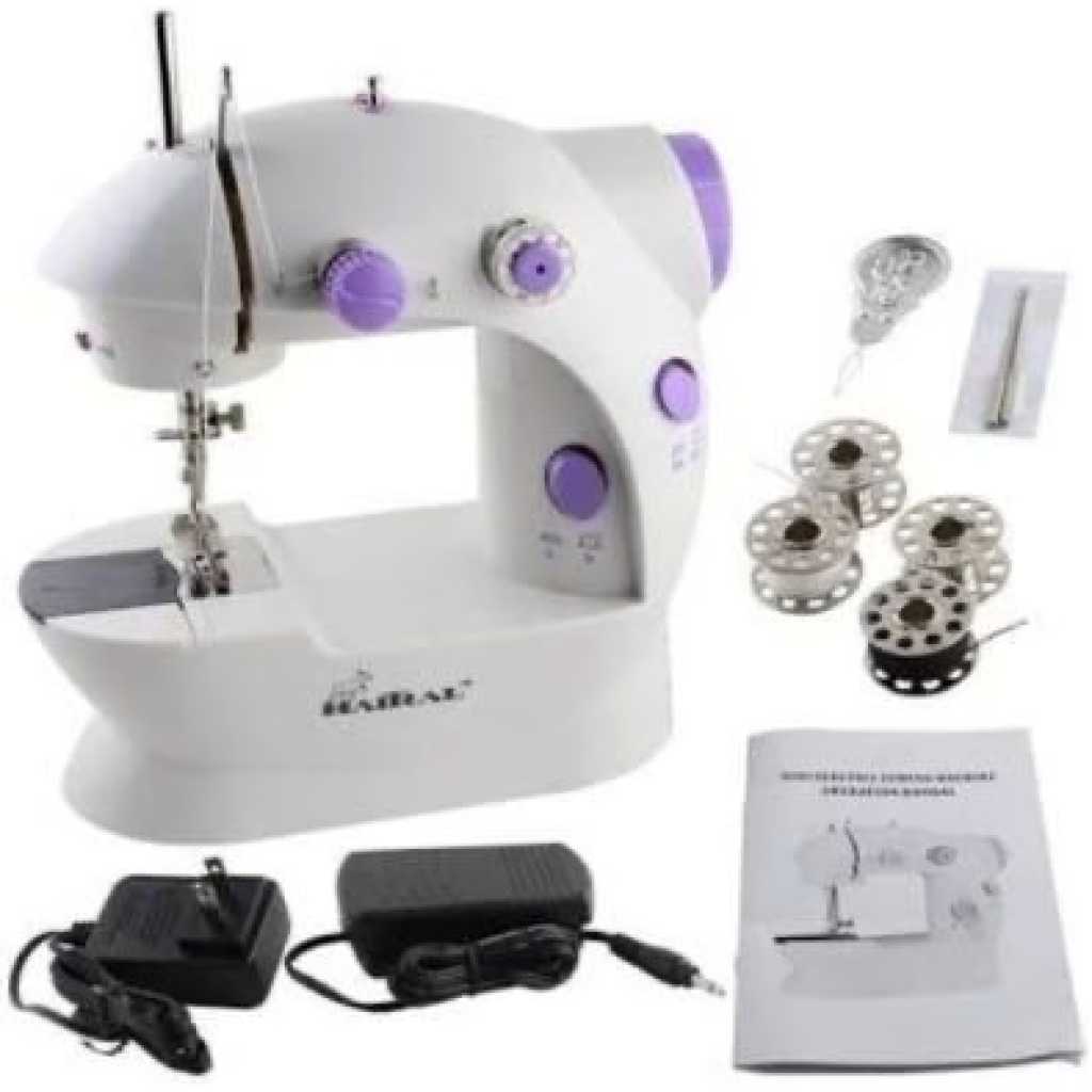 Mini Sewing Machine – White,Purple This portable mini sewing machine has a led light and foot pedal perfect for teens, beginners and sewing enthusiasts to do creative work for crafting, basic sewing and home decoration. Features Double switches, operated by on/off button or foot pedal Your sewing speed can be adjusted conveniently with auto-delutch bobbin winder, Easy reverse stitch button and precise thread tension, has light for precise sewing and built-in thread cutter.