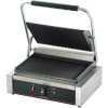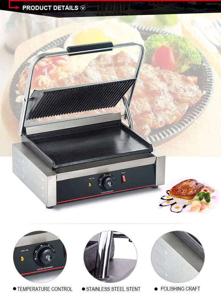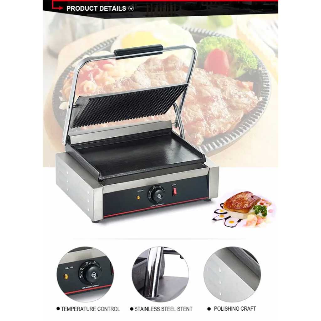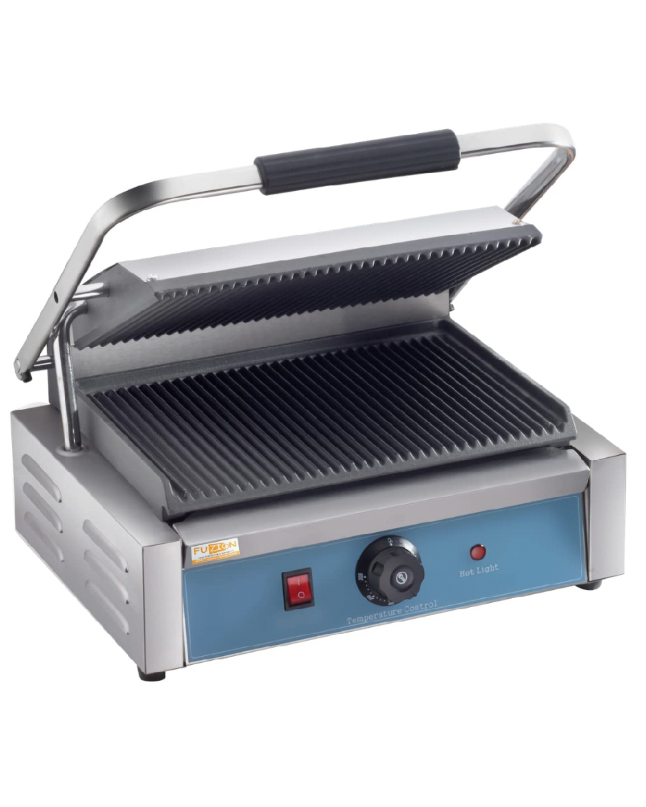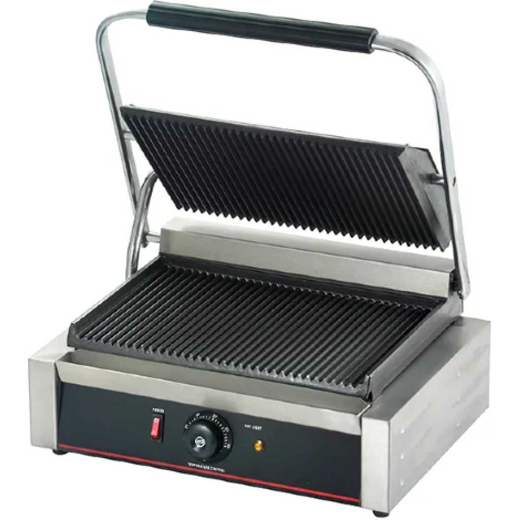 Commercial Single Panini Sandwich Grill with Grooved Plates Order This commercial electric Sandwich griller with copper wire brush & Crump collect tray. A perfect cafe equipment to prepare crispy grilled toasts. Grill sandwiches and other signature foods to perfection with this single panini sandwich grill with grooved plates. Boasting 230V of heating power, this single panini sandwich grill allows you to quickly and efficiently create your most popular sandwiches, quesadillas, and burgers. And, with a compact 12″ x 12″ footprint, you’ll have no trouble finding space for it in your sandwich shop, food truck, or concession stand. Grooved Grill Plates The grooved plates provide tantalizing grill marks for an excellent presentation, while also ensuring complete contact with your product for consistent, even heat supply. The cast iron plate construction provides long-lasting durability and strength. Specialized Hinge The specialized hinge allow the top plate to lay flat against the food rather than at an angle. This ensures complete contact and uniform cooking. Heavy-Duty Construction A heavy-duty, stainless steel construction ensures that the unit is built to withstand a rough and tough kitchen environment. Removable Grease Tray The edge of the grill plate is angled downward to collect grease and direct it into the removable grease tray. When it’s time to clean up, the tray can be removed and emptied quickly. Thermostatic Controls To ensure consistency, the thermostatic controls allow you to adjust the temperature of the grill to accommodate the appropriate cooking temperatures for different foods. With a 120-570 degree Fahrenheit range, you’ll have no trouble keeping up with high-demand. Product Overview Grooved plates provide tantalizing grill marks on paninis or sandwiches Specialized hinge allows top plate to lay flat for uniform cooking Temperature adjusts between 120 and 570 degrees to keep up with high-demand Stainless steel construction and cast iron plate provides durability Great for making paninis, sandwiches, quesadillas, and burger