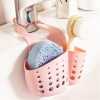 sink organizer Keep this Kitchen Sponge Holder and Drainer near your kitchen sink to keep it mess-free. This sponge holder is designed to keep the kitchen sponge dry. With its detachable strap, you can mount it on sink tap or simply place it near the sink. The porous bottom of this sponge drainer helps to drain water quickly. You can also keep this sponge rack in your bathroom to store your toiletry supplies. It is easy to install and can be conveniently removed whenever needed.