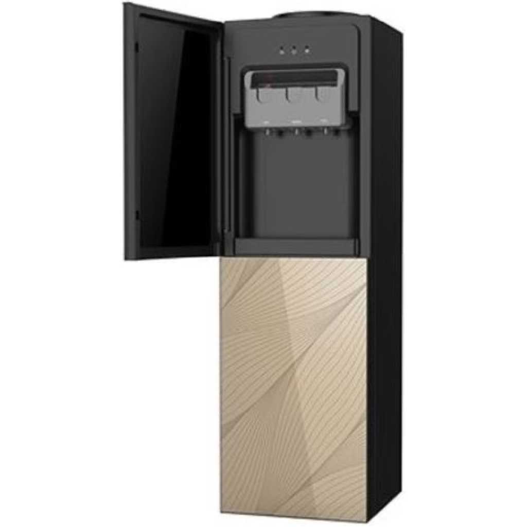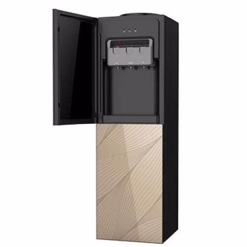 Water dispenser with covered door storage. It has golden glass finished door which makes its attractive look and mix with other furniture. It has three mode; hot, normal & cold. It uses Ac 220v/50hz, heating power:500w, With heating capacity :greater than or equal to 90degree celsius,5.0l/h. Consume cooling power:85w with cooling capacity: less than or equal to 10 degree celsius,2.0l/h. It is Compressor cooling and water tank I made of stainless steel. Its required very limited space of dimension(mm):300x325x1010 to Install. It has shock proof bs plug with 1 Year Warrantee.