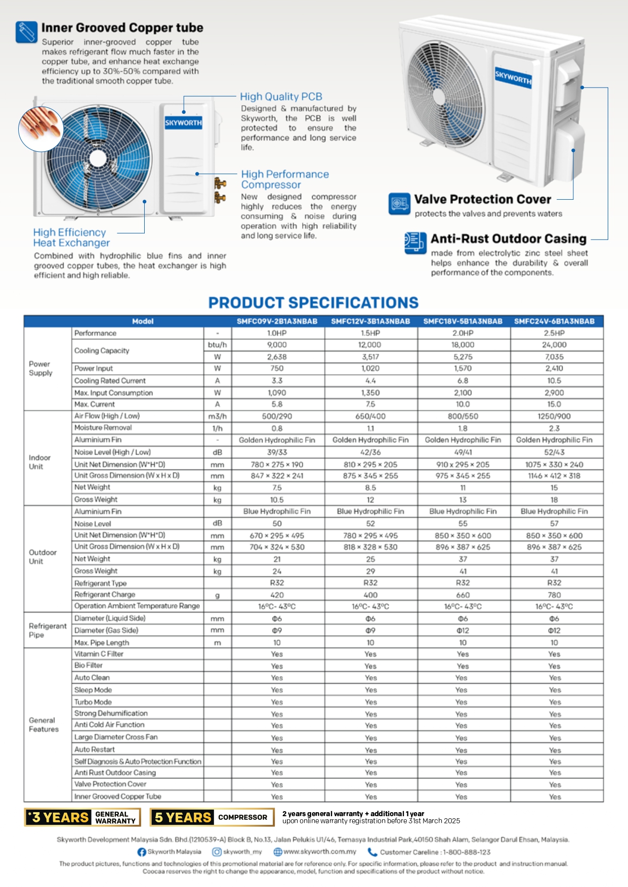 SKYWORTH 24,000 BTU, SPLIT TYPE AIR-CONDITIONER, INVERTER WITH COOLING AND HEATING Model SMFC24V-6B1A3NBAB Performance 2.5HP Cooling Capacity 24,000 btu/h 7,035W Power Input 2,410 W Cooling Rated Current 10.5 A Vitamin C Filter Yes Bio Filter Yes Auto Clean Yes Indoor Unit Aluminium Fin GOLDEN HYDROPHILIC FIN