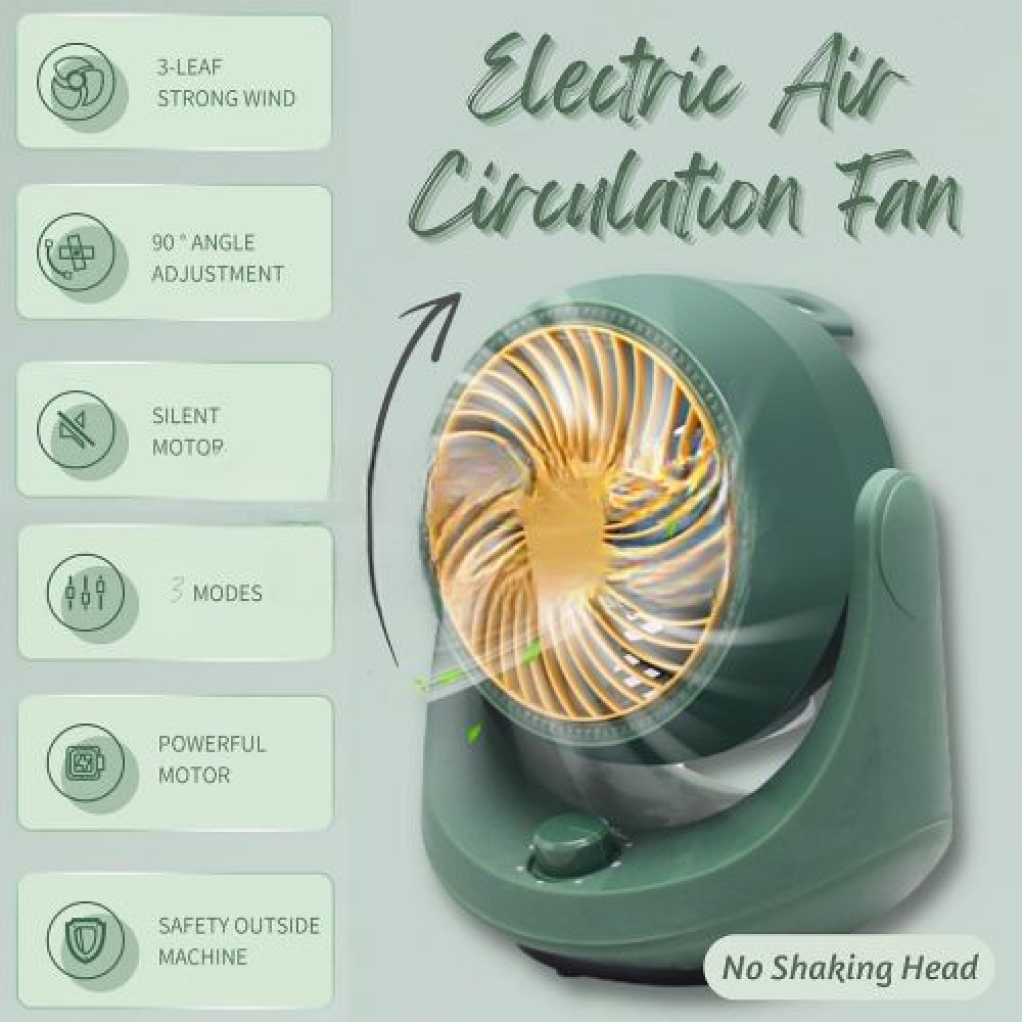 Small Mini Office Desktop Fan, Table Air Circulation Fan, Household Silent Electric Fan, 35nb Low-Noise Operation, Turbo Fan Design- Green Small portable desktop circulating fan , three-speed wind speed adjustment, rapid circulation of indoor air, fine grid mesh cover, safe and not hurting hands. Three types are available to meet the needs of different groups of people. The detachable net cover is convenient for cleaning and makes the wind smoother. Model A mechanical model without head shaking function Rated power: 30W Speed adjustment: three-speed adjustable Timing function: without Shaking head setting: no left and right rotation/can be adjusted manually up and down Air supply mode: soft/normal/strong Power cord length: about 1.2 meters Net weight of the machine is 1.4kg Model B mechanical model with a head shaking function Rated power: 30W Speed adjustment: three-speed adjustable Timing function: without Shaking head setting: Rotate left and right/can be adjusted manually up and down Air supply mode: soft/normal/strong Power cord length: about 1.2 meters Net weight of the machine is 1.4kg Model C remote control function style Rated power: 30W Speed adjustment: three-speed adjustable Timing function: 12H timing Shaking head setting: left and right automatic / can be adjusted manually up and down Air supply mode: soft/normal/strong Power cord length: about 1.2 meters Net weight of the machine is 1.4kg Product size: length 25cm*width 19cm*height 26cm