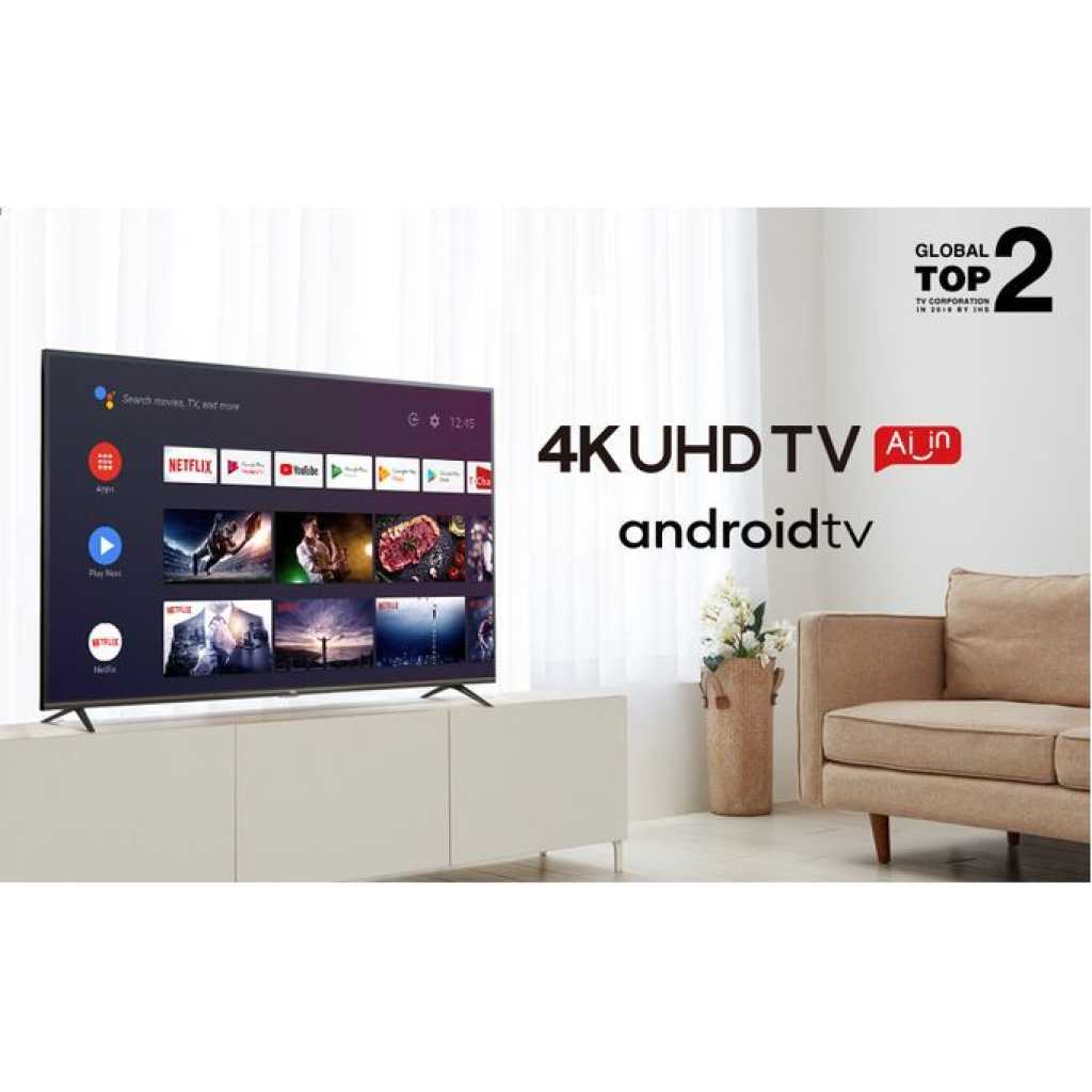 Key Features: SmartPlus 65 inch 4K UHD Android Smart TV. Display size: 65 Inches SMART TV Built-in decoder Bluetooth Connectivity Wi-Fi, Ethernet Android 9.0 Free to air channels DVB T2 channels system High definition USB slot HDMI ports VGA port PC in AV mode Audio out (headphones)