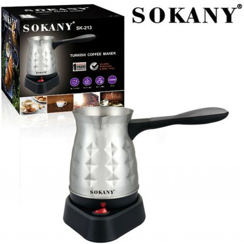 Key Features: Brand: Sokany Type: Coffee maker Material: Stainless Steel Wattage: 600 Watts It can prepare 5 cups of coffee Capacity: 500 milliliters Easy to clean Easy operation to prepare a cup of coffee