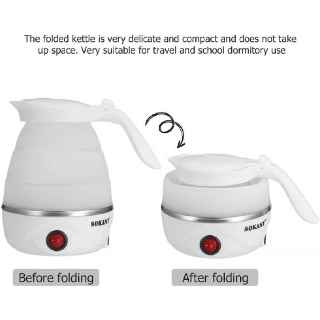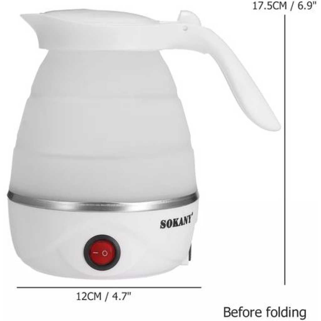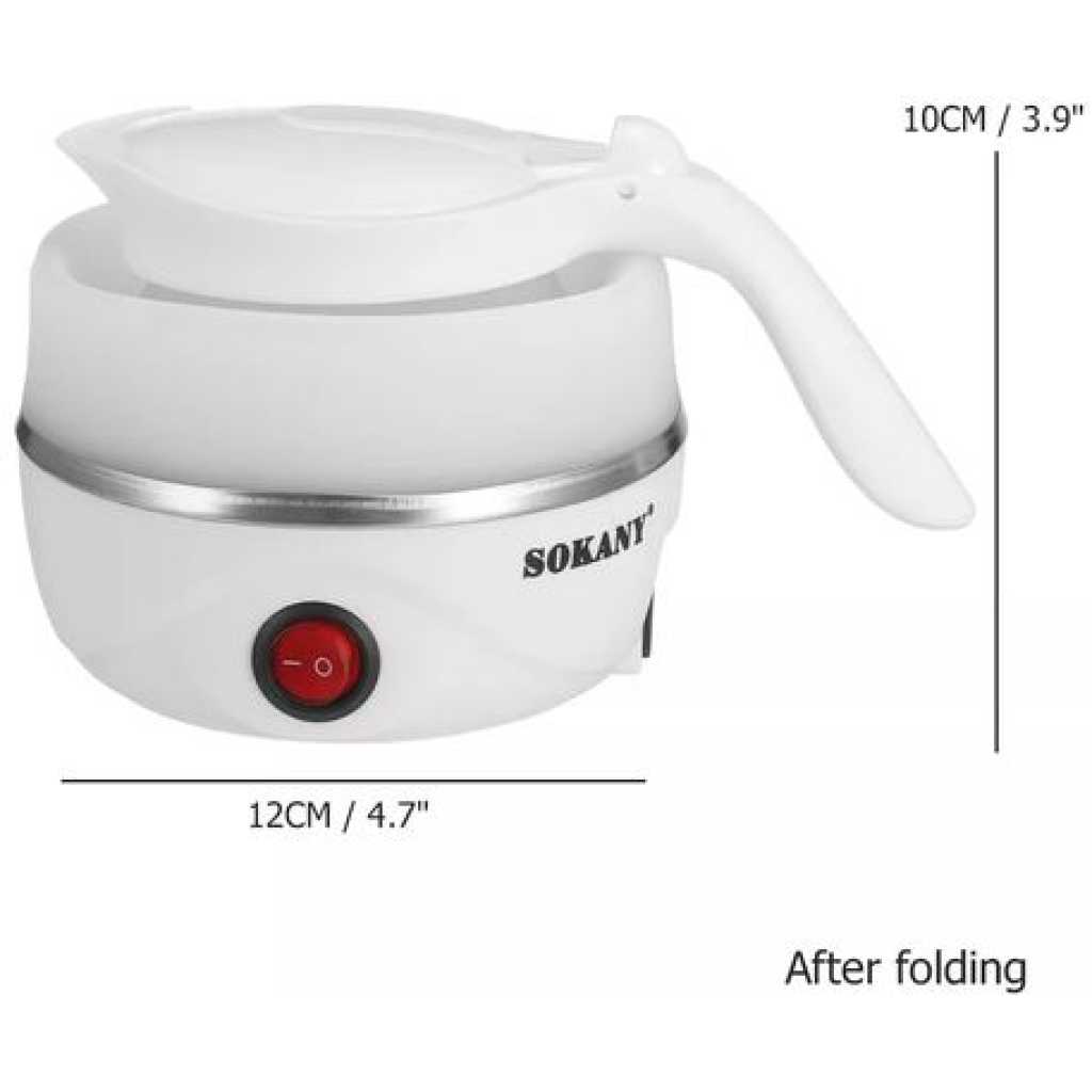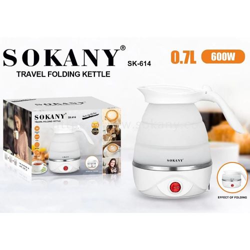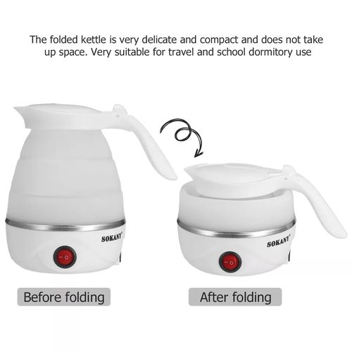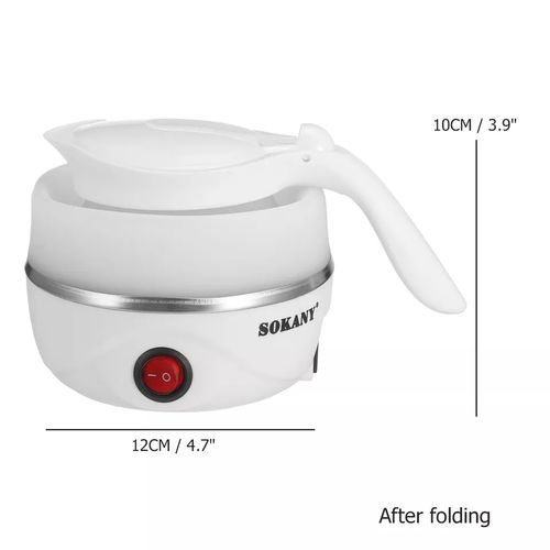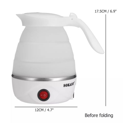 Key Features: Sokany 0.7L Expandable & Collapsible Travel Silicone Portable Electric Kettle (White) EASY STORAGE- Lightweight and Durable – Designed to Collapse for easy storage & travel and expand to boil water and brew coffee, tea, and more. NEW DETACHABLE CORD and FOLDING HANDLE. DUAL VOLTAGE – Built-in dual voltage for use universally on any continent! 100-240v voltage. FAST BOILING – The high capacity of the electric heating control board allows for fast boiling. AUTOMATIC INSULATION – The insulation function automatically heats to boiling again after cooling SAFETY FEATURES – The product has Boil Dry Protection that automatically turns off the kettle when there is no water left to prevent dry boiling.