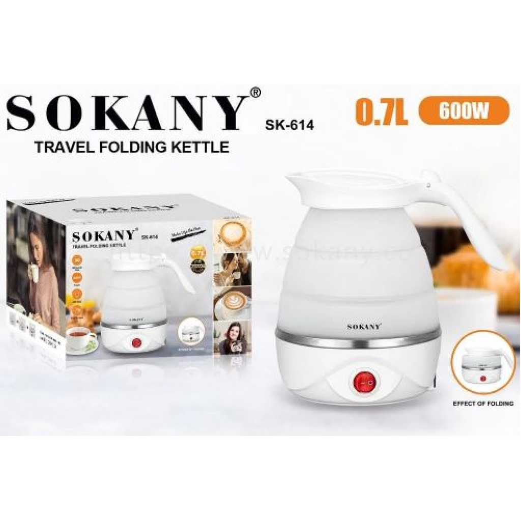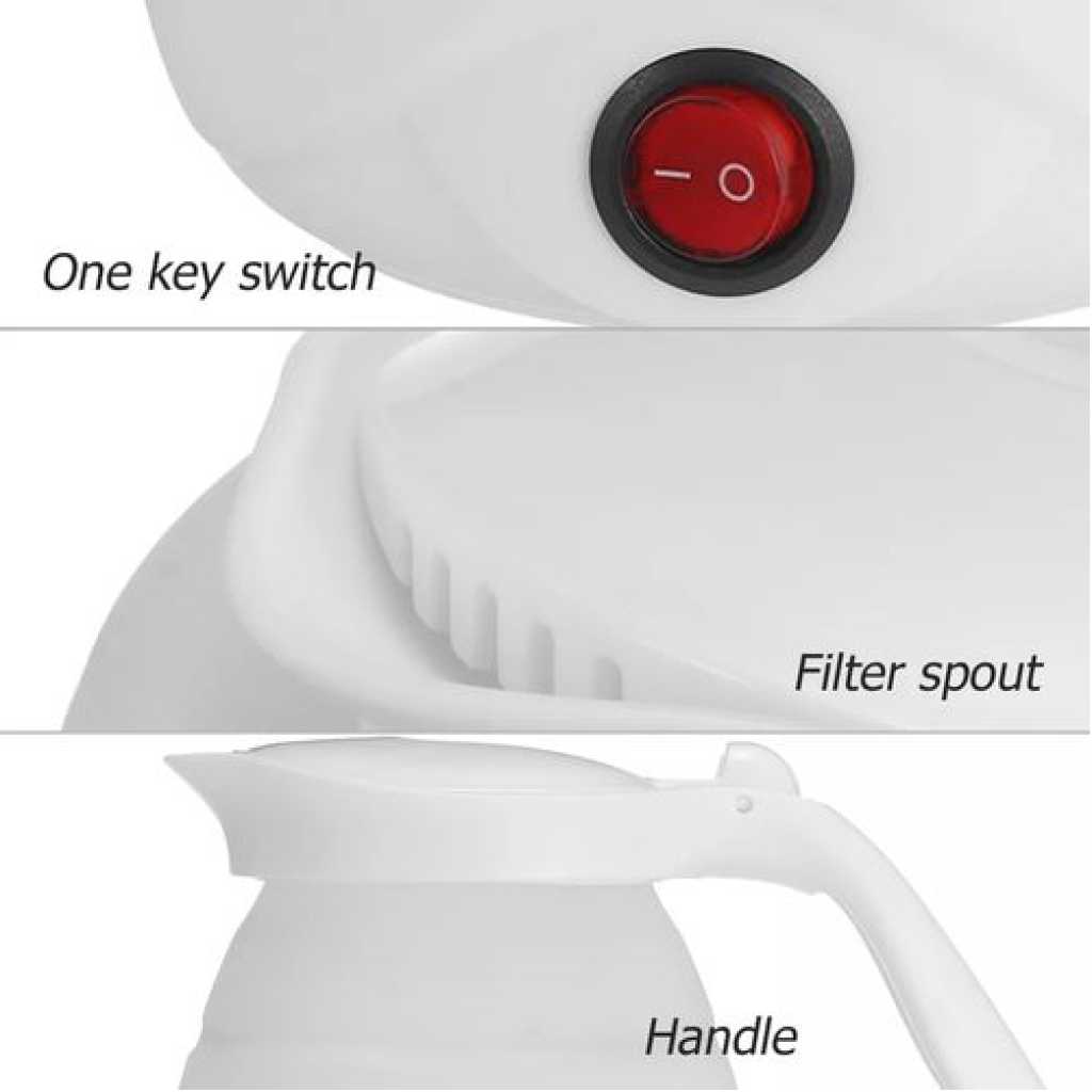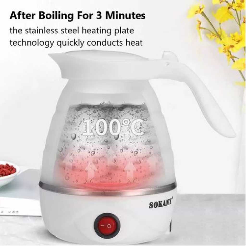 Key Features: Sokany 0.7L Expandable & Collapsible Travel Silicone Portable Electric Kettle (White) EASY STORAGE- Lightweight and Durable – Designed to Collapse for easy storage & travel and expand to boil water and brew coffee, tea, and more. NEW DETACHABLE CORD and FOLDING HANDLE. DUAL VOLTAGE – Built-in dual voltage for use universally on any continent! 100-240v voltage. FAST BOILING – The high capacity of the electric heating control board allows for fast boiling. AUTOMATIC INSULATION – The insulation function automatically heats to boiling again after cooling SAFETY FEATURES – The product has Boil Dry Protection that automatically turns off the kettle when there is no water left to prevent dry boiling.